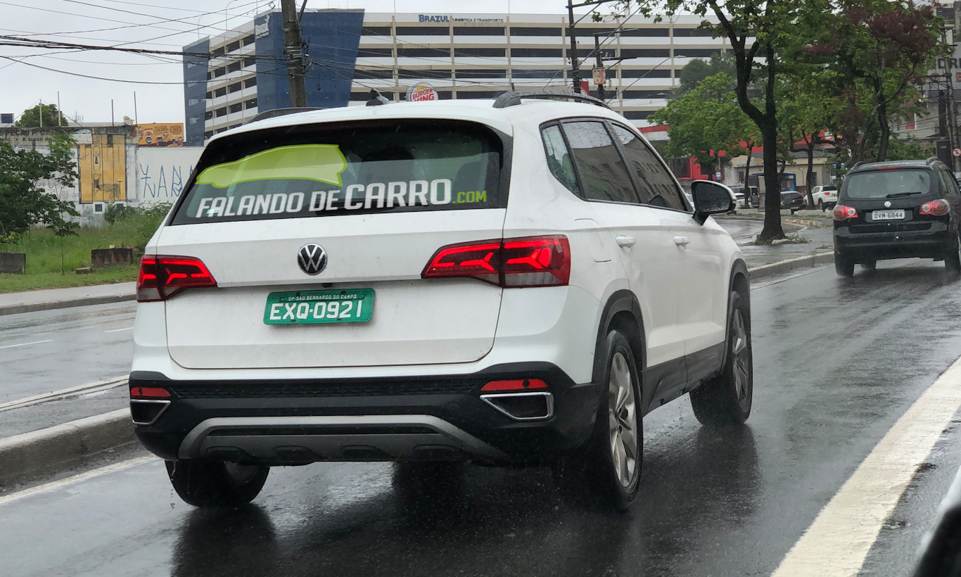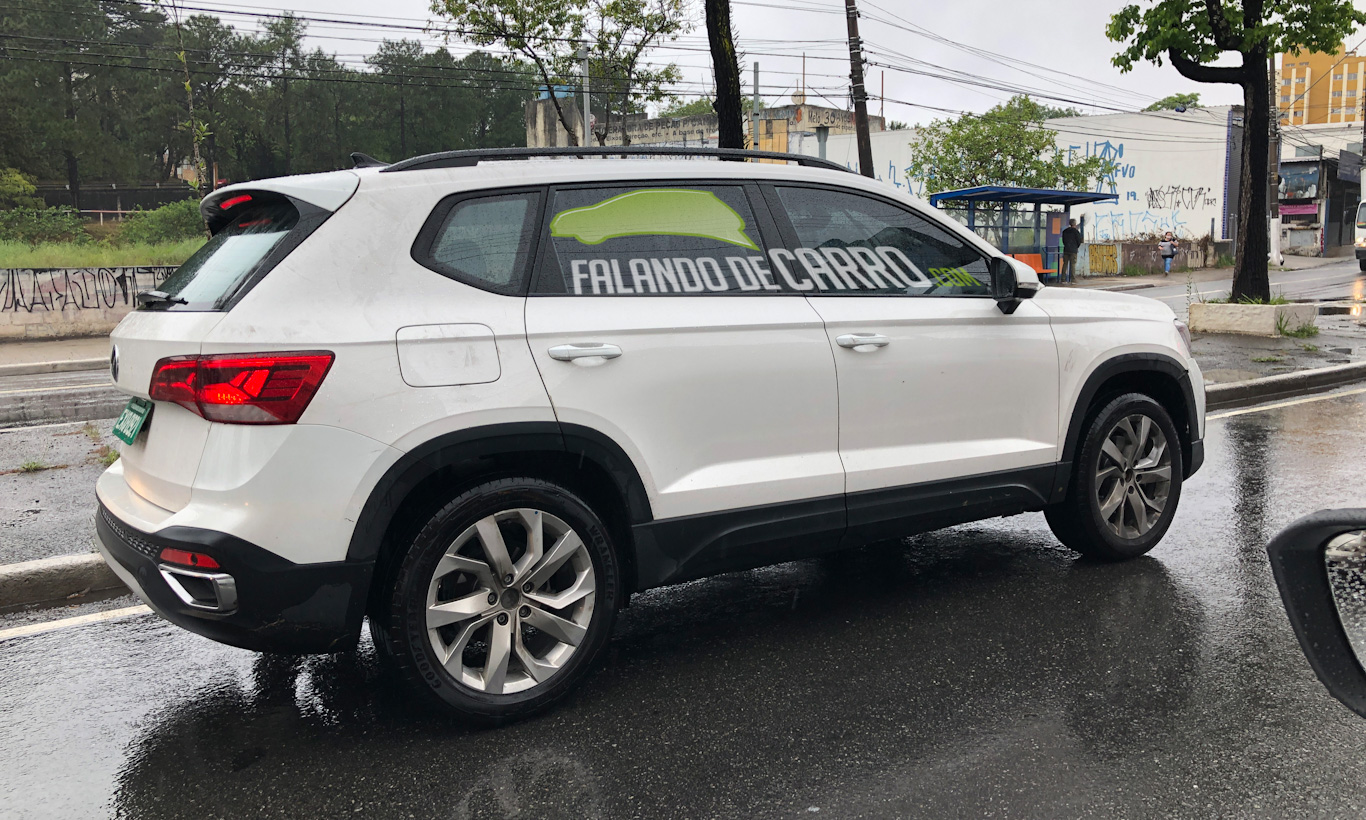 Mais barata, a versão Comfortline tem rodas de liga-leve menores e sem acabamento diamantado presente no Taos topo de linha. Atrás ele mantém as lanternas de LED, saída dupla de escape falsa e aplique cinza no para-choque.