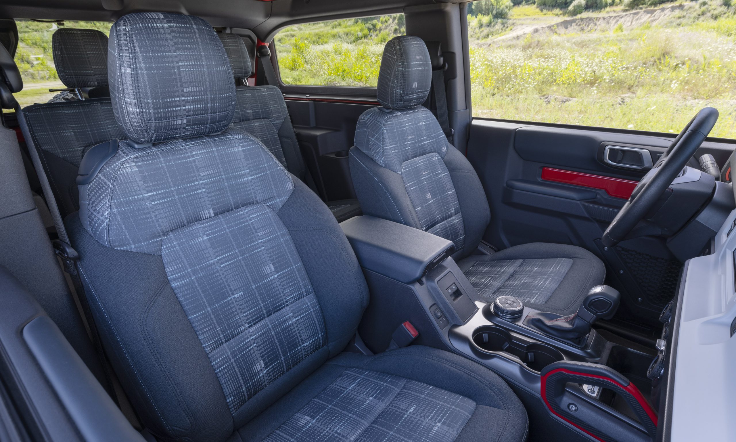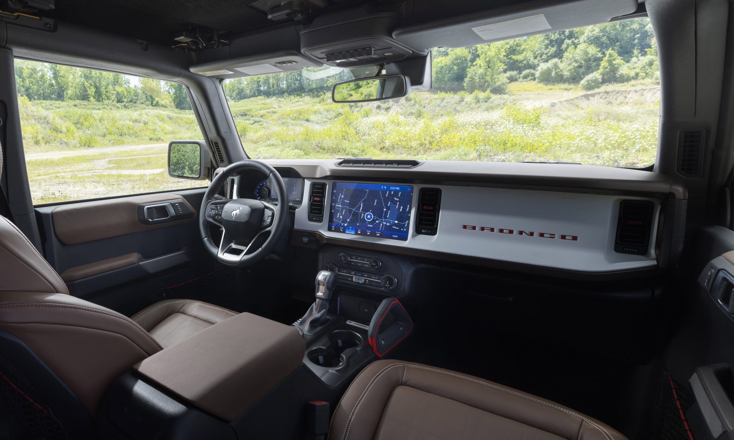 O Bronco também recebe para-lamas mais quadrados e um novo para-choque dianteiro, que se destaca por vir com detalhes em aço, ganchos de reboque e faróis de neblina. No interior, as novidades ficam por conta dos bancos em tecido xadrez e toques exclusivos, como painel de instrumentos com detalhes na cor Branco Oxford, emblema do console central e revestimentos exclusivos no piso dianteiro e traseiro. O Bronco Sport segue praticamente as mesmas mudanças internas.