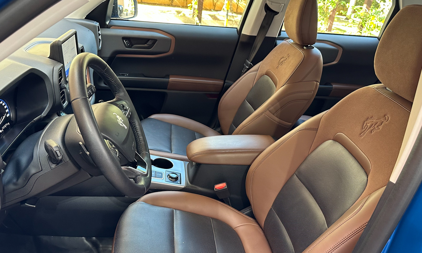 Enquanto a Maverick combina marrom, azul marinho, preto e cinza no interior, o Bronco Sport é mais sóbrio. Preto e marrom são os tons dominantes aqui, especialmente nos bancos. O couro usado é de qualidade de marcha premium, tanto que o volante é acolchoado.