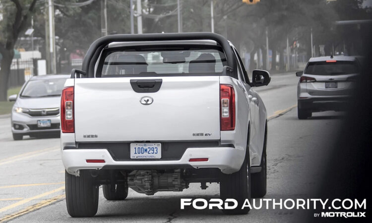 O flagra feito pelo Ford Authority revela a GWM Poer EV branca em testes pela engenharia da Ford pelas ruas de Dearborn, onde fica o centro de desenvolvimento da marca. A caminhonete veio diretamente da China, como mostram os logotipos em mandarim na traseira.