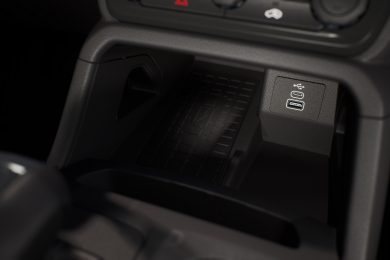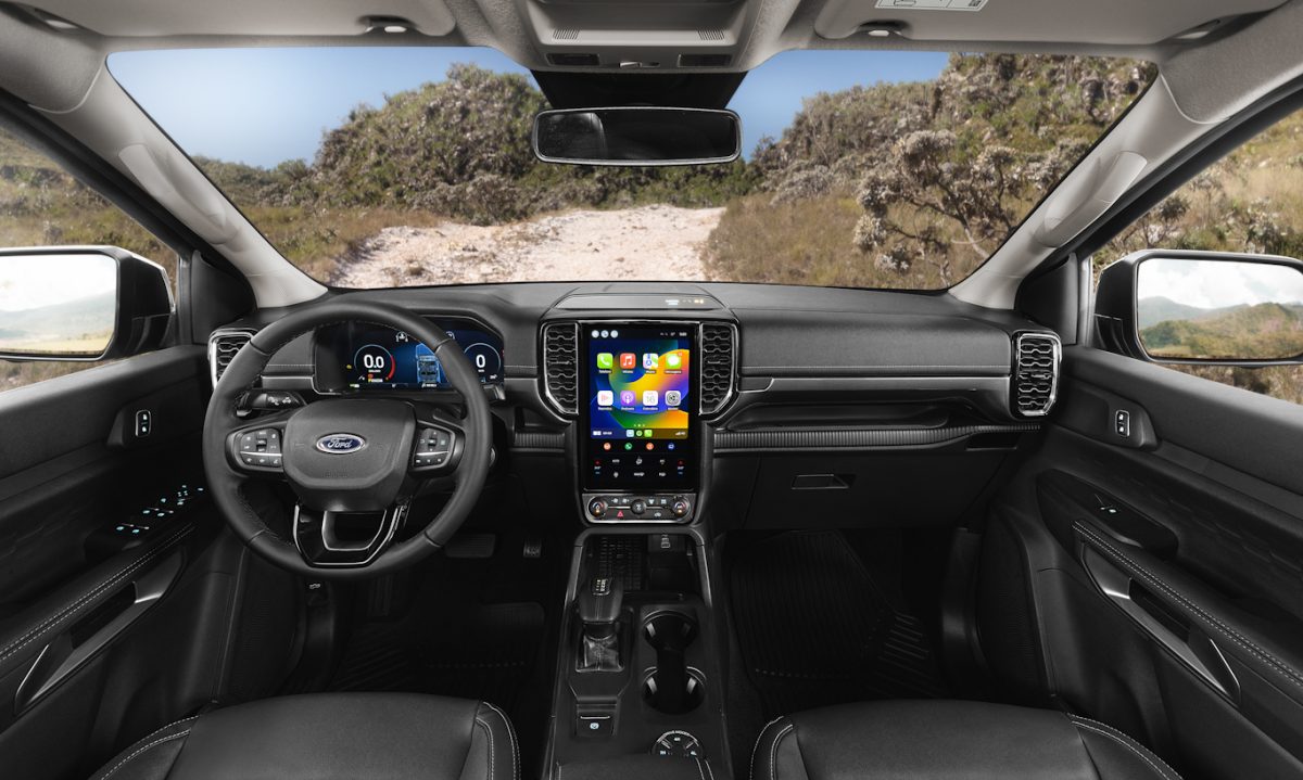 Visualmente, a cabine da nova Ranger bebe da mesma fonte da F-150 e traz linhas bem americanas. O formato reto e horizontalizado do painel contrasta com as linhas arredondadas do modelo anterior. Há partes aparentemente macias ao toque com revestimento de couro no painel, além de dois porta-luvas.