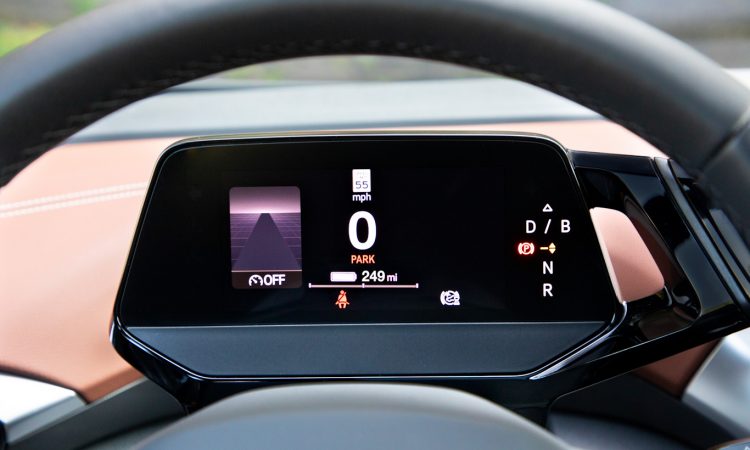A cabine é arejada, minimalista, mas ainda com cara de Volkswagen. O volante é o mesmo do Nivus, mas com comandos sensíveis ao toque. Ela é acoplada ao minúsculo painel de instrumentos totalmente digital e também à alavanca de câmbio retangular. Há botão de partida na coluna de direção, mas ele é apenas redundante para ligar o ID.3 e sair andando.