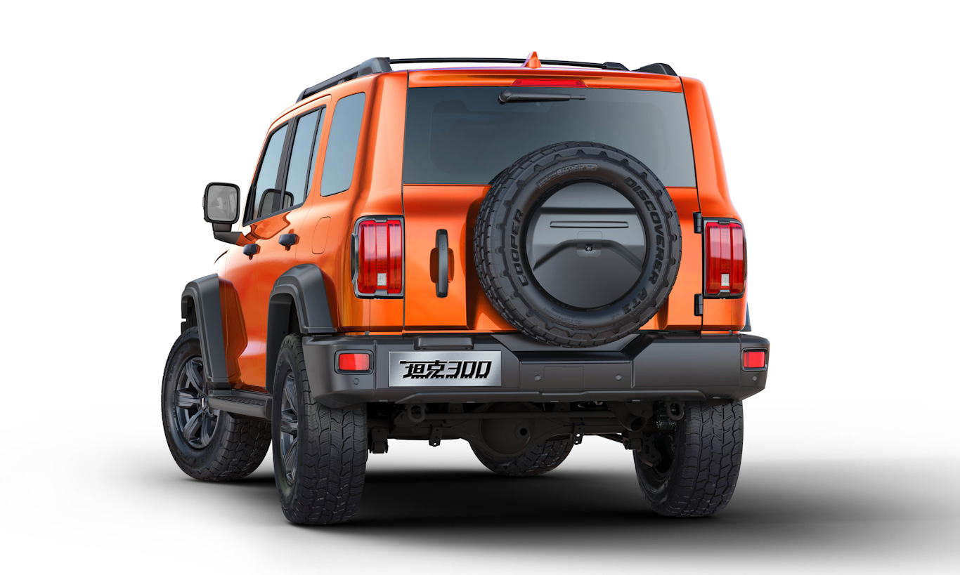 O Tank 300 PRO traz para-lamas alargados com plástico preto para abrigar as rodas maiores e os pneus off-road. Além disso, ele recebeu para-choques de ferro menores que o original a fim de melhorar o ângulo de entrada e de saída.