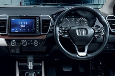 Nesse híbrido, o Honda City e:HEV oferece lista de itens de série bem semelhante à versão Touring, mas com algumas perdas e adições ao mesmo tempo. Não há câmera no retrovisor direito ou central multimídia com Android Auto e Apple CarPlay sem fio, mas ele conta com teto solar e luzes ambiente não oferecidas em versões brasileiras do compacto.