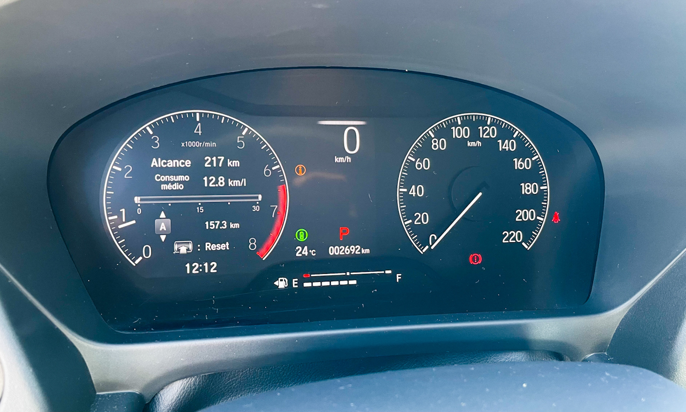 O contraste ruim fica entre a central multimídia e o painel de instrumentos parcialmente digital. O cluster é completo, cheio de recursos e o fato de ter um velocímetro analógico torna a experiência bem interessante – é, sinceramente, melhor que muito painel 100% digital. Tem computador de bordo completo e é rápido na hora de mostrar informações.