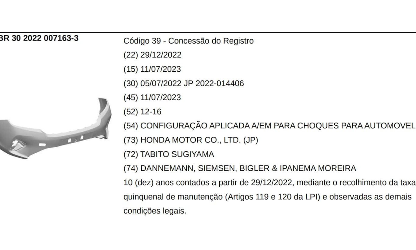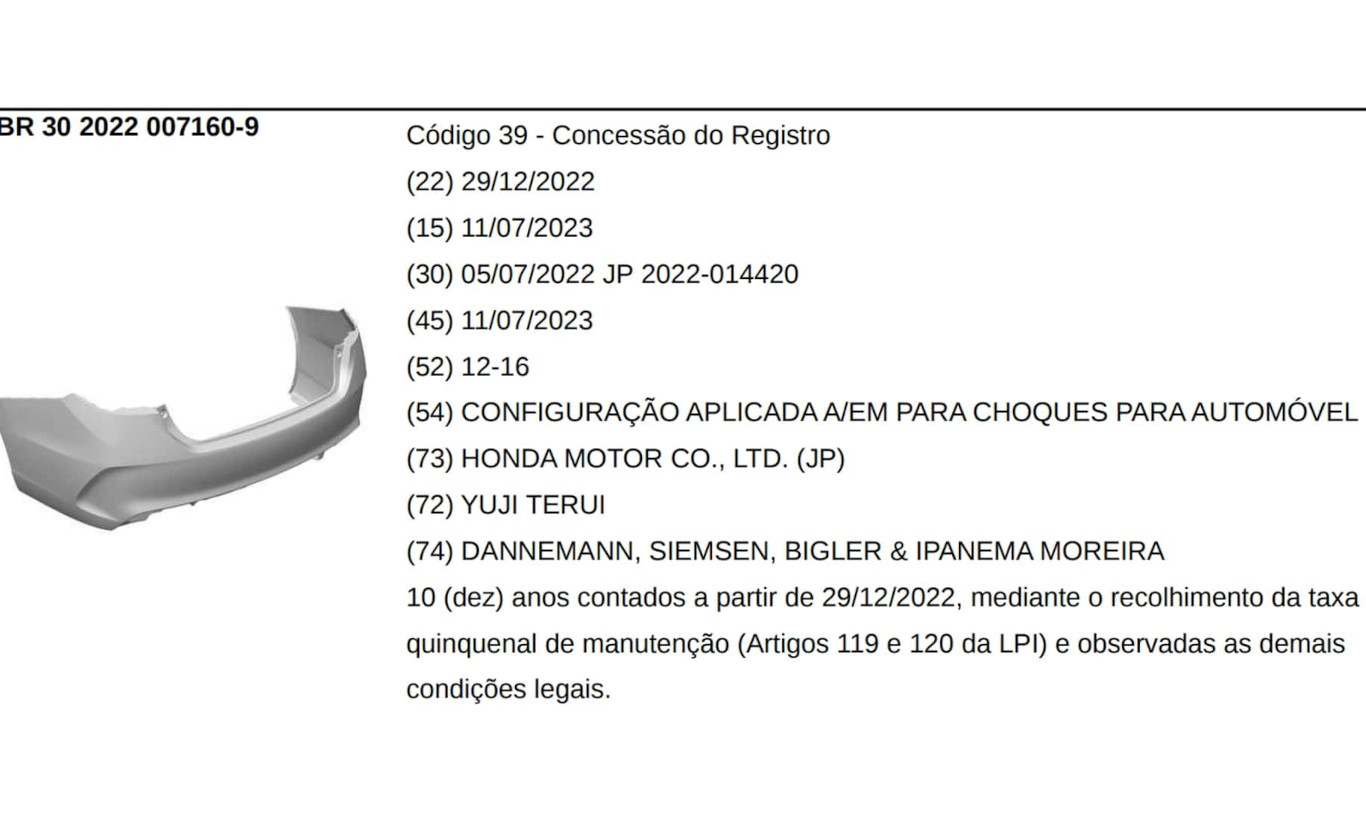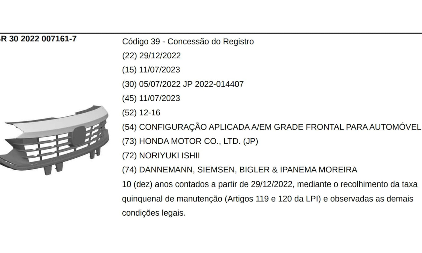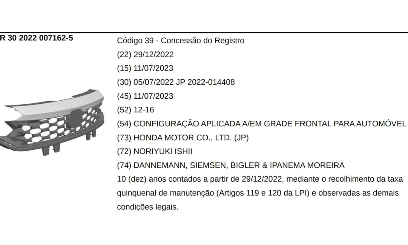 A primeira evidência de que o City reestilizado será vendido no Brasil é o registro de patente da Honda, que pede proteção de desenho para partes específicas, como a grade dianteira e os para-choques.