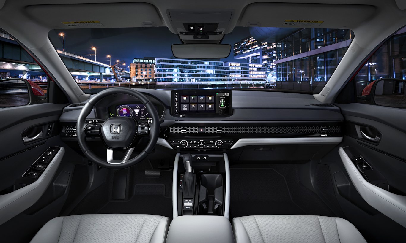 Visualmente, a nova geração do Accord se destaca pelas novas linhas. Na dianteira, ele se destaca por vir com faróis mais afilados e conectados com a grade dianteira. Esta, possui um desenho hexagonal e tem linhas transversais com o logotipo da Honda ao centro. O Accord ainda tem uma entrada de ar inferior com duas barras horizontais e uma entrada de ar nas extremidades, num tom prateado.
