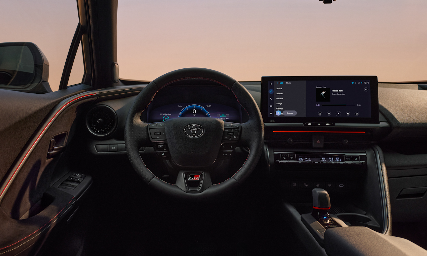 Por dentro, o modelo tem visual igualmente esportivo. Console central alto combinado a linhas que envolvem o motorista, deixam o C-HR com uma pitada apimentada. O modelo conta com uma enorme central multimídia, mas os comandos de ar-condicionado, felizmente, são separados. Painel digital também marca o visual.