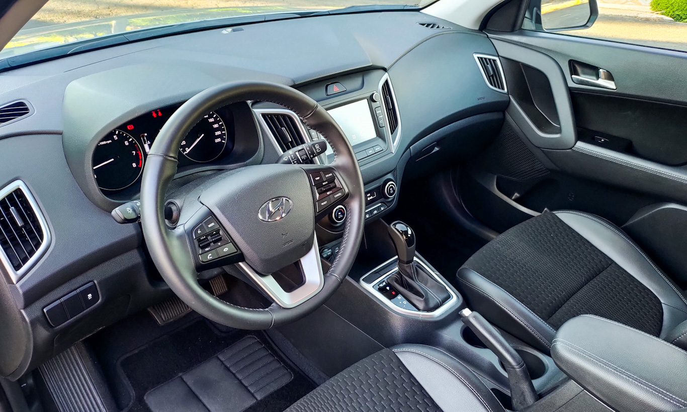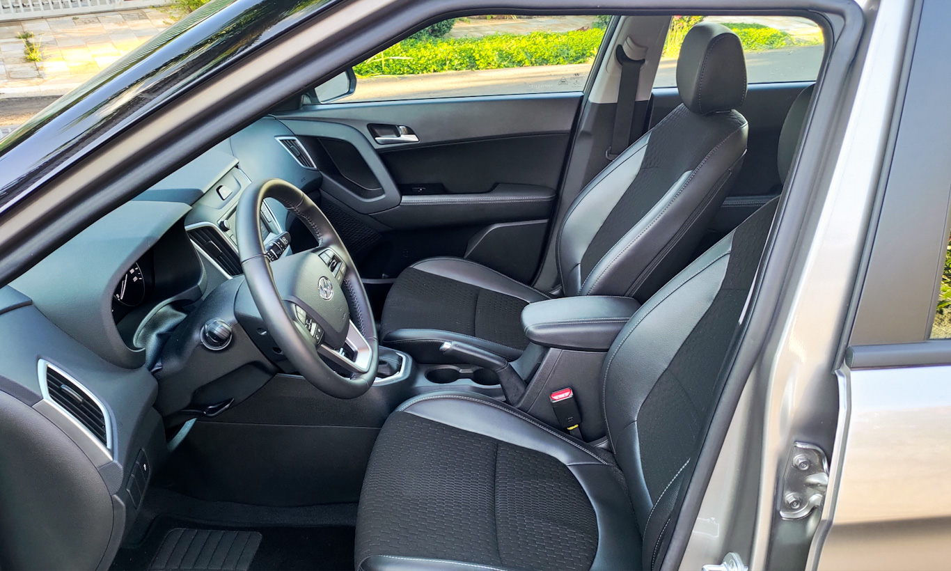 Há de destacar sobre o volante, além da qualidade dos materiais a amplitude de ajustes. Tanto em altura quanto em profundidade, ele se tem vasta área de movimentação. O mesmo vale para os bancos: ou seja, é fácil encontrar uma posição correta para dirigir no Creta. O que ajuda ainda mais o fato de os bancos serem confortáveis.