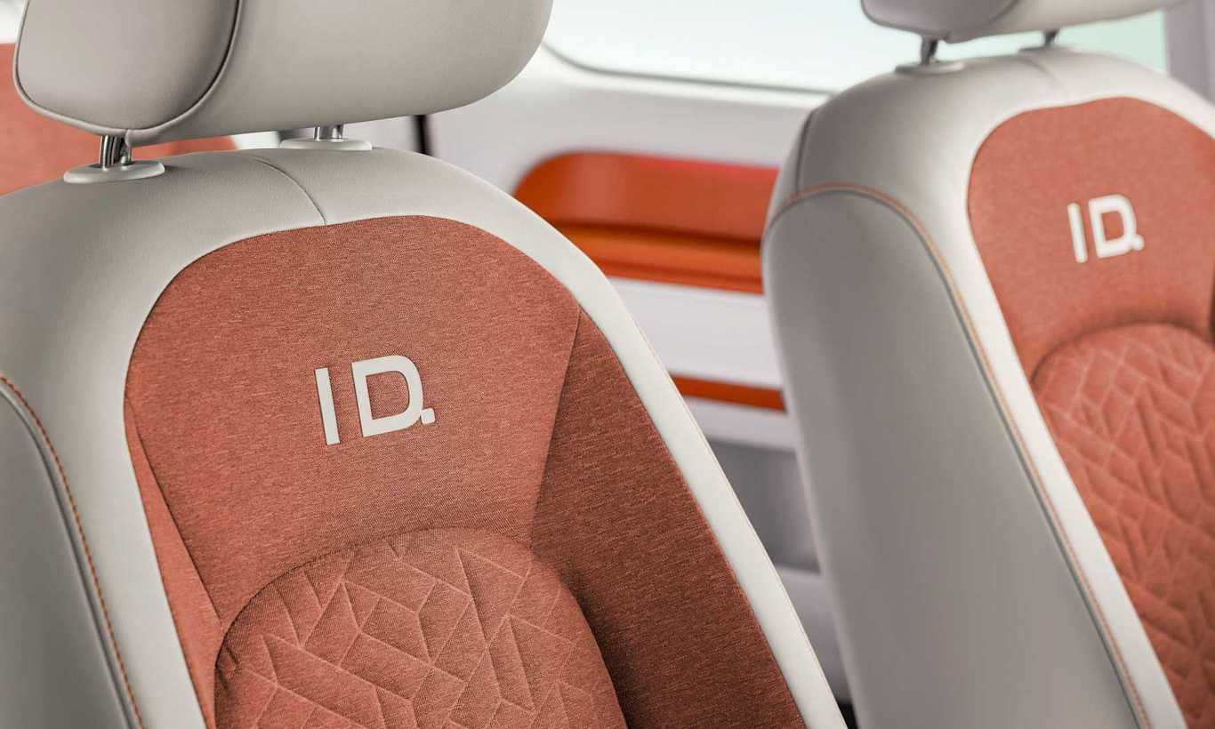 Na ID.Buzz, a Volkswagen resolveu caprichar. O modelo revelado tem interior que mescla couro branco com tecido e costuras laranja. As portas mesclam plástico branco com couro laranja, enquanto o volante também traz a tonalidade mais clara possível. É possível ver comandos elétricos para os bancos dianteiros e apoios de braço duplos.