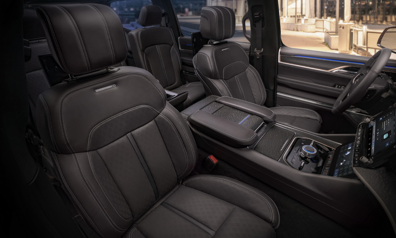 Ao abrir a porta é possível ver como o jogo do Grand Wagoneer é mais alto que o de outros Jeep já fabricados até hoje. A cabine é luxuosa, recheada de mimos eletrônicos e superfícies decoradas com couro, madeira ou metal. Destaque para o console central alto que divide bem a área para cada passageiro dianteiro.
