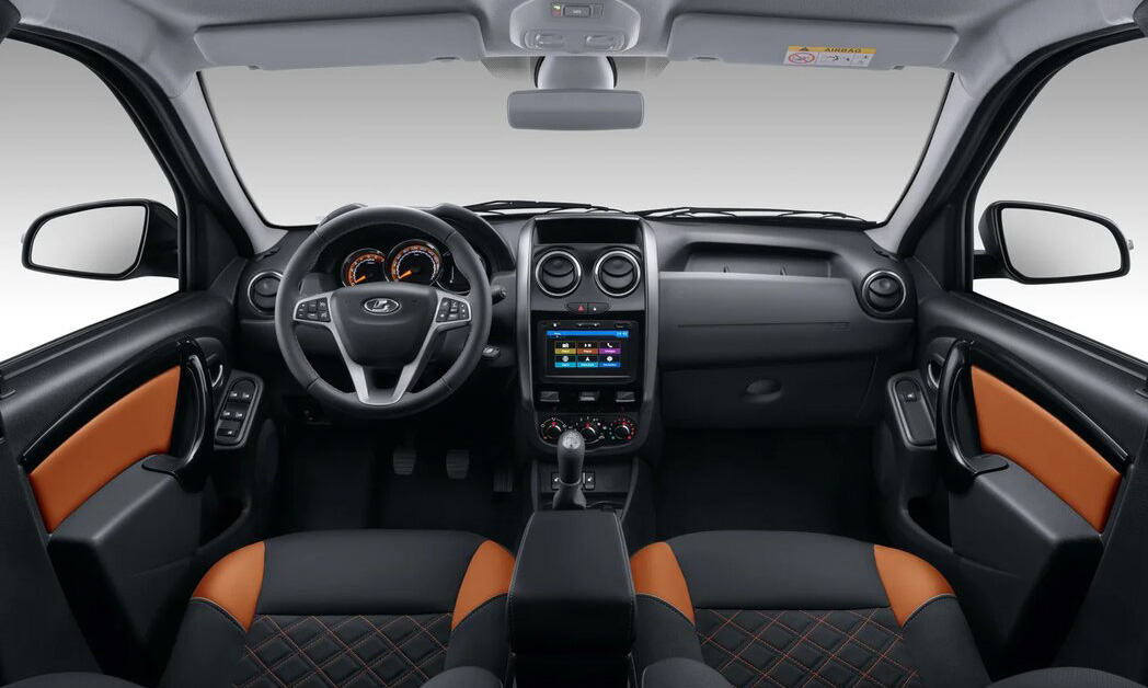 O visual é uma mistura de elementos Renault, Dacia e Lada. Os faróis, por exemplo, vieram da segunda geração de Logan e Sandero, a mesma que está no Brasil. Já a grade frontal em X é típica da Lada e forma um desenho interessante e moderno.