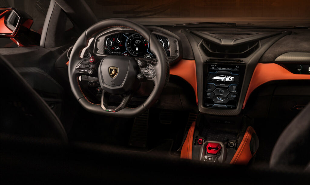 A Lamborghini optou por manter um propulsor V12 aspirado, mas agora com três motores elétricos aliados. Por si só o L545 6.5, que é uma evolução do motor do Aventador, consegue entregar 825 cv e 73,9 kgfm. Sendo assim essa é a motorização de 12 cilindros mais potente da história da Lamborghini. E seu último V12.