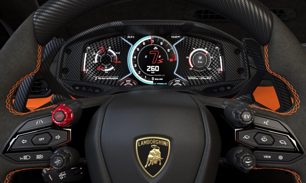 Por dentro o novo superesportivo italiano traz um painel totalmente digital de 12,3”, aliado a uma central multimídia vertical de 8,4”. Ele conta ainda com uma terceira tela que é dedicada ao passageiro, com um tamanho de 9,1”. E todas as três possuem funções interligadas. Já o modo de condução agora traz 13 configurações diferentes controladas pelo volante.