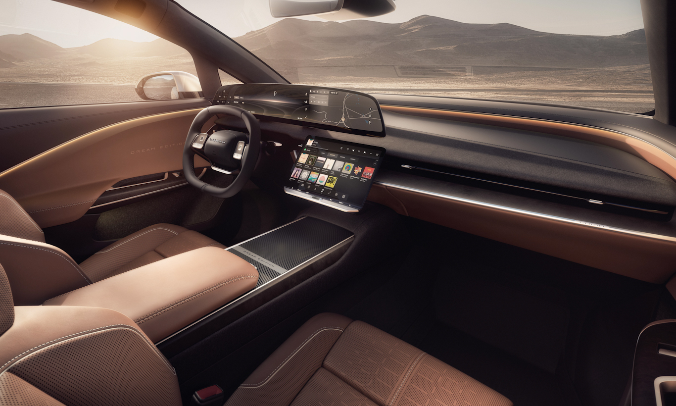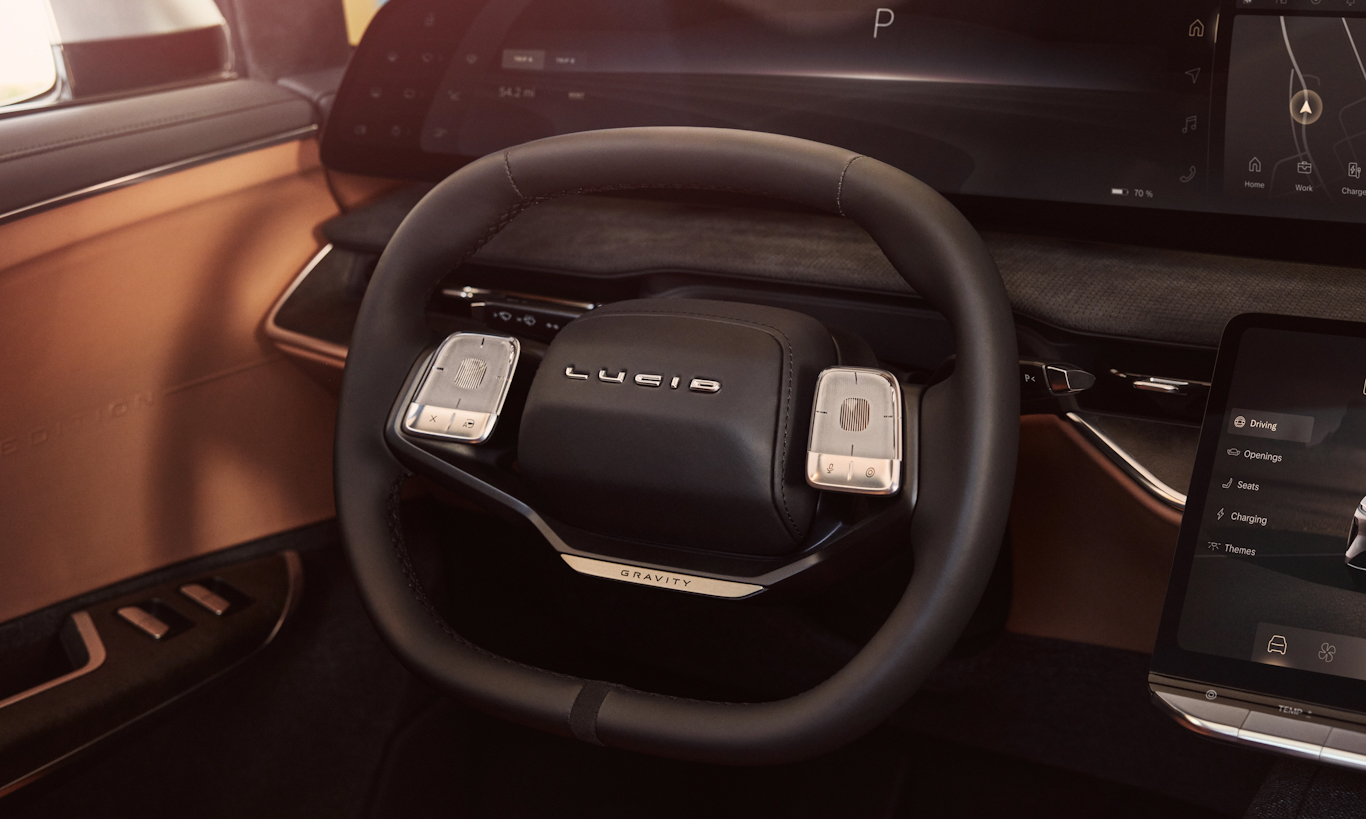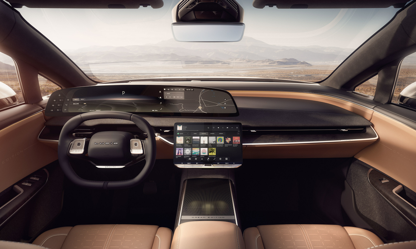 Com disponibilidade para 7 passageiros, o Lucid Gravity é bem refinado e completo em seu interior. Sem dúvidas uma das coisas que mais chamam atenção na cabine é a tela de 34”, logo acima do volante. Apesar de ser imensa, ela não está sozinha, pois logo abaixo existe uma outra tela dedicada à central multimídia.