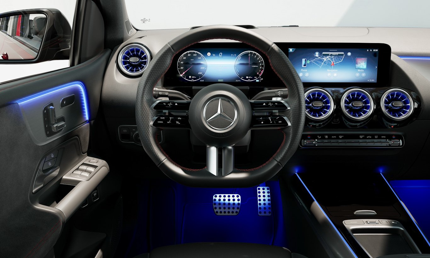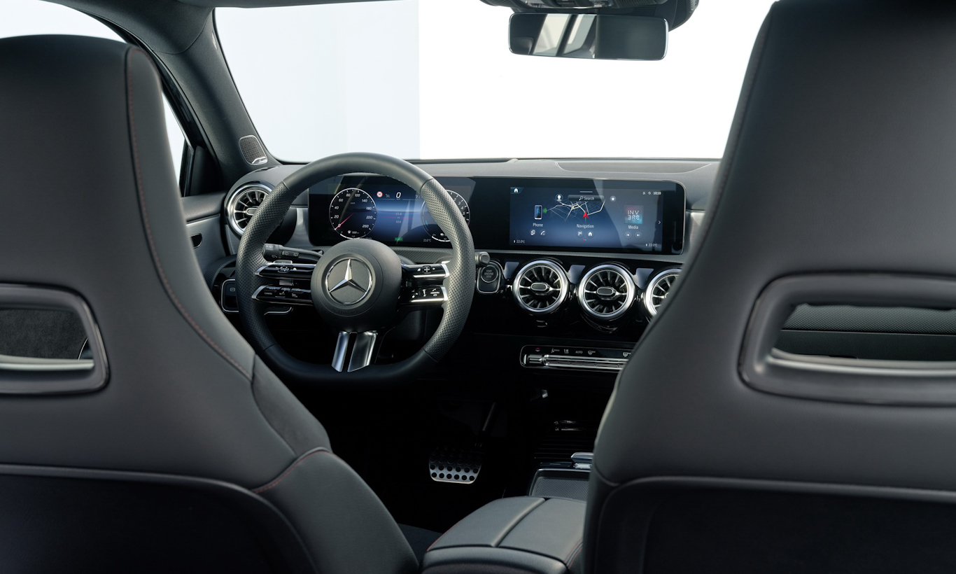 Por dentro, os dois Classe A e a Classe B ganharam volante com base reta com novo desenho. O console central foi modificado e perdeu o touchpad para controle da central multimídia, sendo substituído por um novo porta-objetos. Painel de instrumentos é sempre digital, com 7 polegadas, mas pode crescer para as mesmas 10,25 polegadas da central multimídia.
