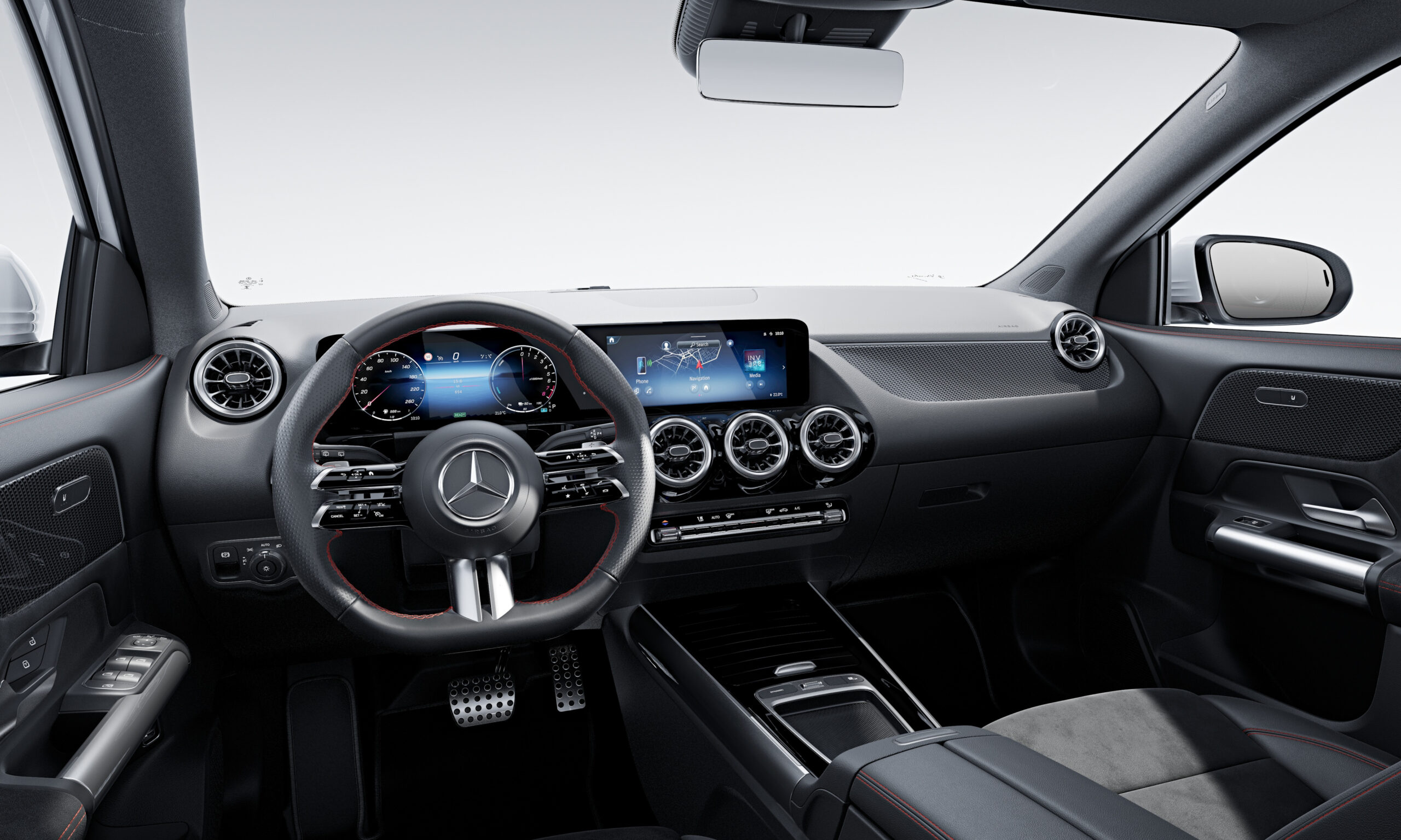 Na parte interna dos novos Mercedes-Benz GLA 2024, os destaques vão para as duas telas de 10,25 polegadas, sendo uma para o painel de instrumentos e a outra como central multimídia. O sistema de entretenimento MBUX ganhou atualizações, há uma nova porta do tipo USB-C e as demais portas USB passam a ser iluminadas. Aliás, as conectividades Android Auto e Apple CarPlay são compartilhadas sem fio.