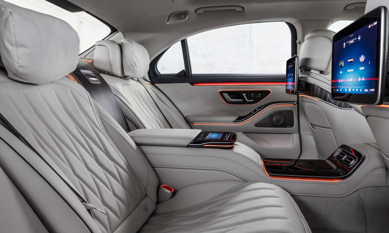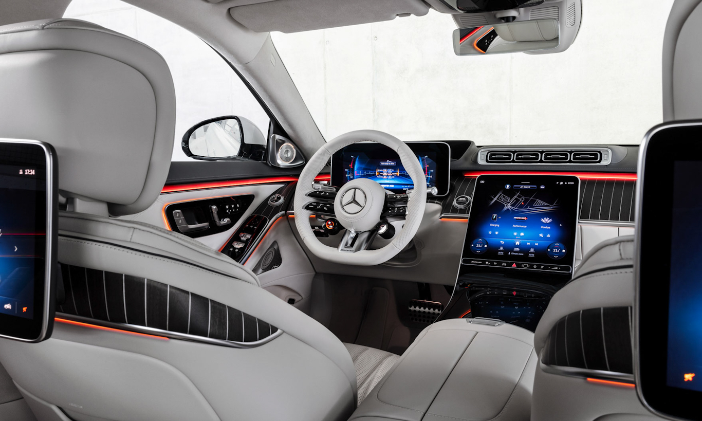No interior, o Classe S novamente traz o melhor de dois mundos da Mercedes. Com espaço para quatro ocupantes, o sedã possui bancos com estofados novos e com costuras AMG. O logotipo da AMG ainda está no encosto de cabeça dos bancos, enquanto o quadro de instrumentos e central multimídia possuem um grafismo exclusivo.