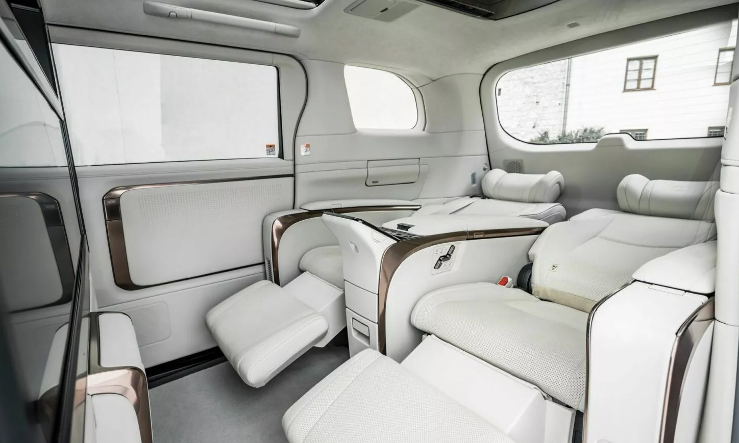 Os bancos traseiros podem ser reclinados e foram inspirados nos assentos dos aviões. Eles podem ser aquecidos, ventilados e fazem até 7 tipos de massagem diferente no passageiro. Além disso, contam com um sistema que segura o passageiro durante a frenagem da minivan. Seu revestimento é de couro especial. O intuito da LM é ser um avião sobre rodas, dessa forma, a montadora quis trazer lazer em todos os sentidos.