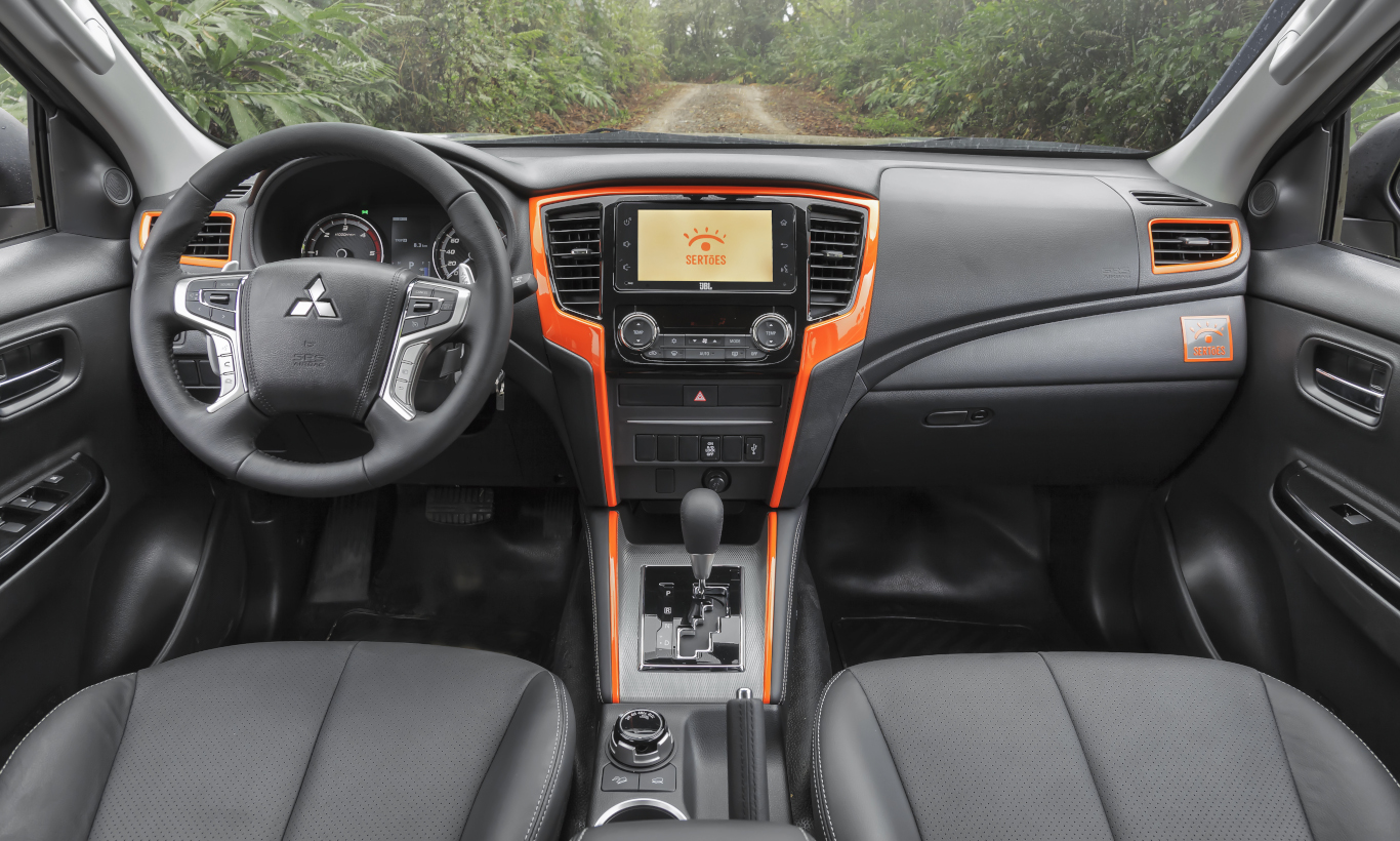 Esse tom de laranja está presente em faixas no capô, em uma barra na parte superior da grade, e no skid plate localizado abaixo do para-choque dianteiro. Detalhes em preto brilhante na grade também compõem o visual da L200 Triton Savana Sertões.