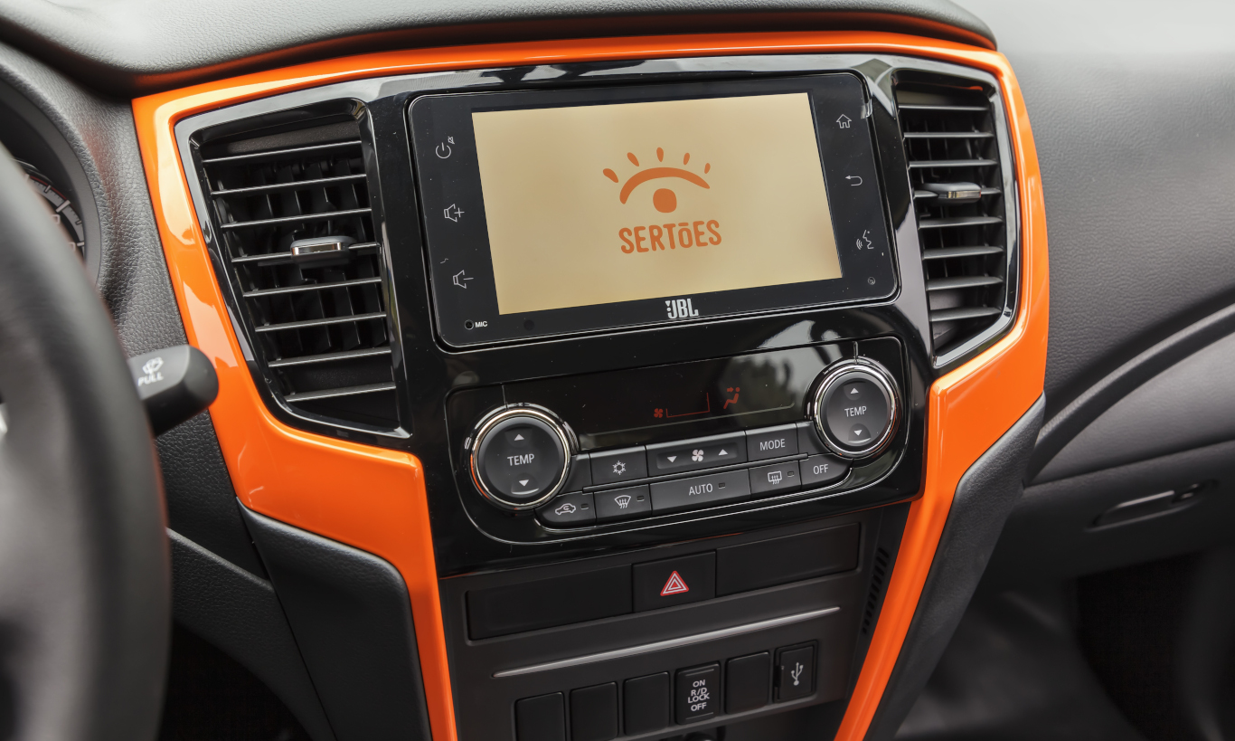 Assim como o exterior, a cabine é repleta de detalhes em laranja. A cor está presente na moldura das saídas de ar e no acabamento central do painel. O logotipo dos Sertões também está presente.