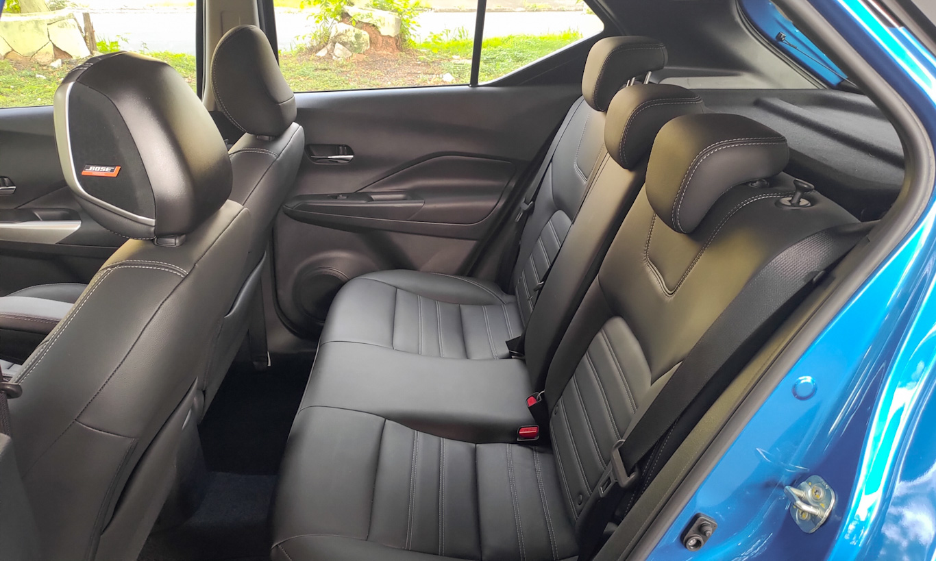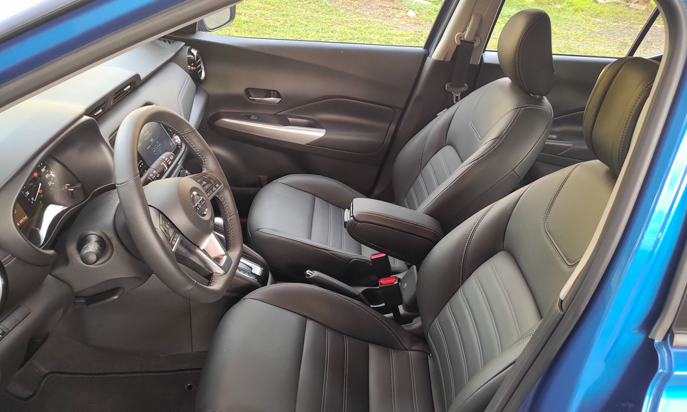 Outro ponto em que o Kicks se destaca bastante é no interior. Ele é generosamente espaçoso em qualquer fileira. Os bancos dianteiros são, sem dúvida, os mais confortáveis da categoria. Tem boa quantidade de ajustes, são macios e o couro que os reveste tem boa qualidade.