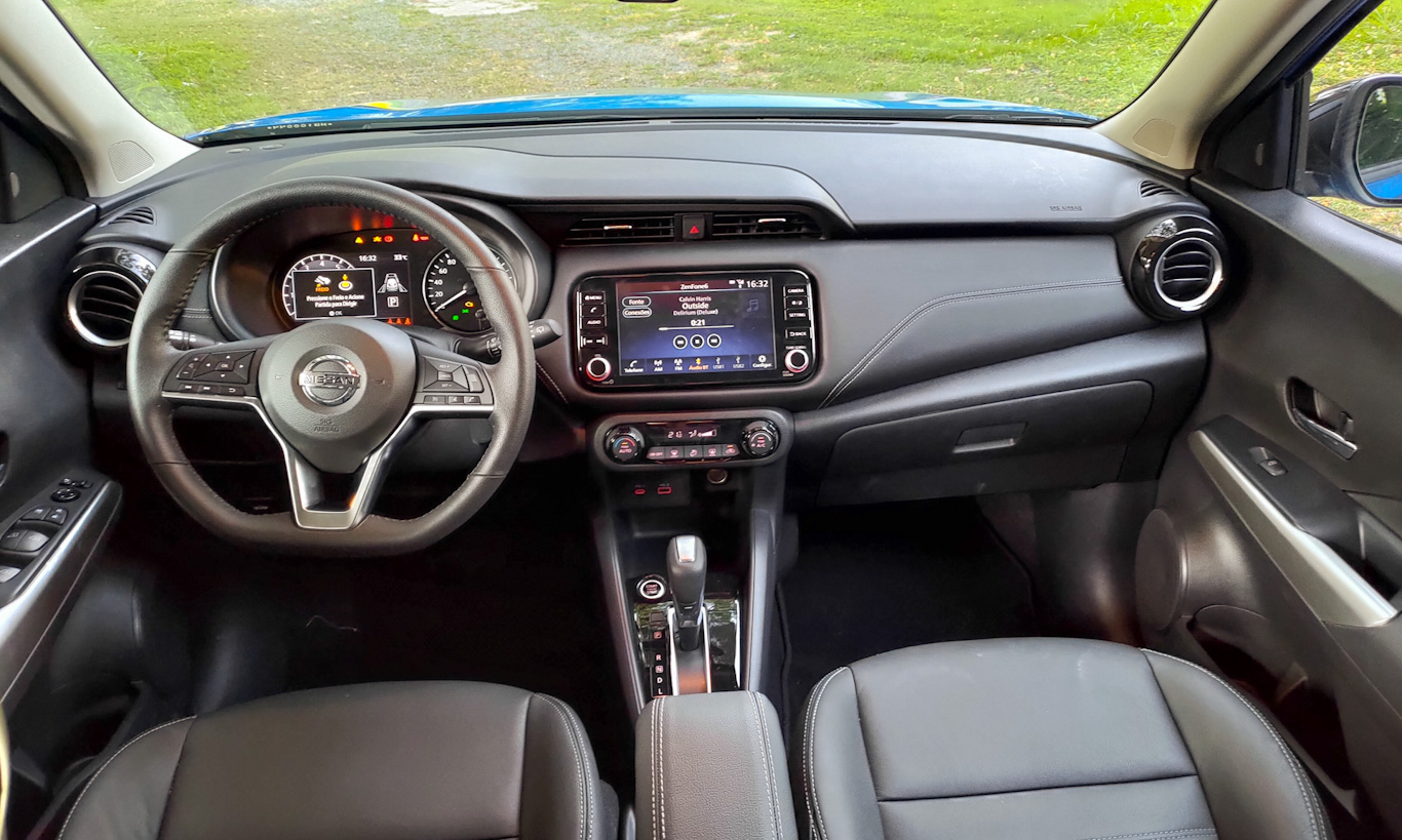No Kicks tudo funciona sem excesso e de maneira equilibrada. O volante não corrige a trajetória, mas vibra de maneira suficiente para que o motorista perceba que está fazendo algo errado. Assim também funciona o alerta de ponto cego, com pequenas luzes e um bipe sem ser escandaloso.