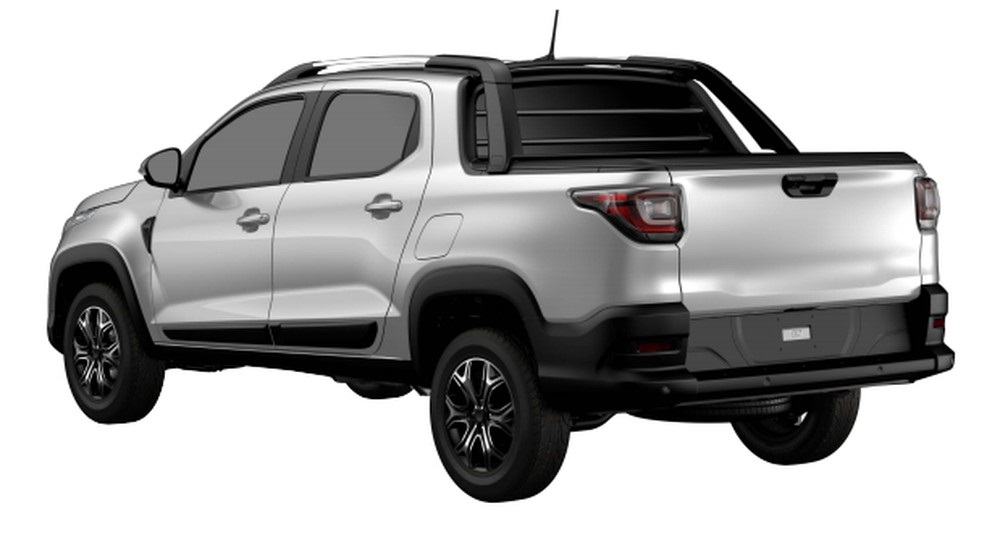 Já a traseira e a porção lateral são os ângulos mais parecidos ao da Fiat Toro, principalmente se reparar na lanterna, com desenho praticamente igual ao da picape maior. Repare no desenho da janela lateral das portas traseiras e no formato quadrado das caixas de rodas e também se lembrará semelhanças com a Toro. No entanto, a tampa da caçamba virá com abertura convencional, ao contrário da Toro, que traz tampa dividida e com abertura para os lados.