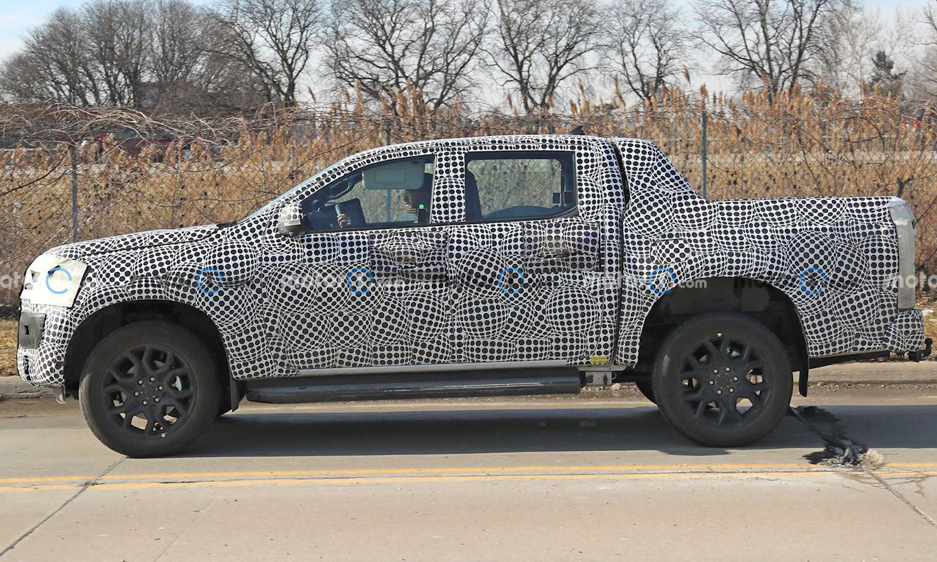 Assim como o restante da carroceria, a parte central da picape conta com uma camuflagem pesada. Mas este deve ser o ponto que mais vai lembrar a Ranger, pois existe a possibilidade das portas serem compartilhadas entre os modelos.