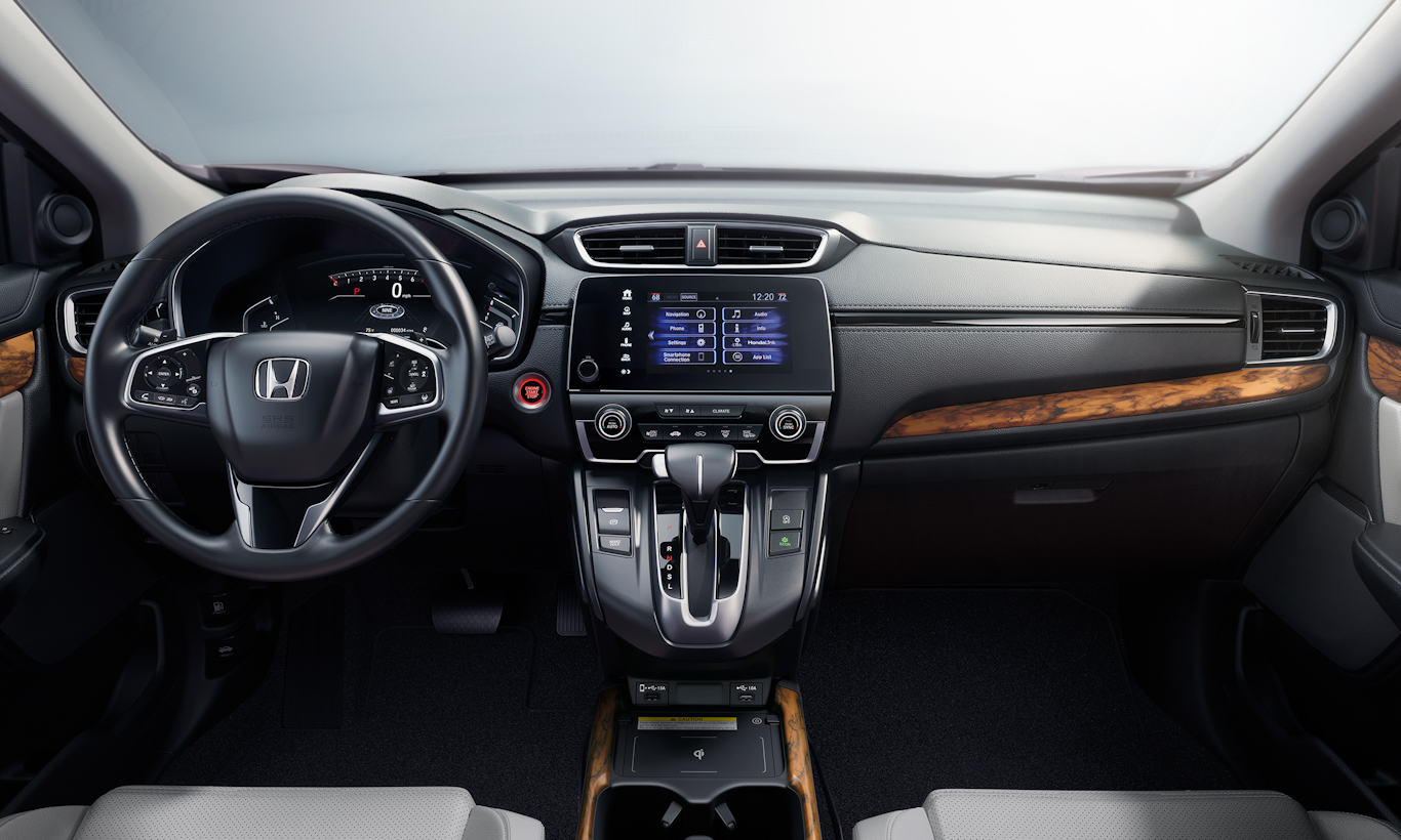 Já no interior o SUV compartilha a mesma concepção de design com a nova geração do Honda Civic. As linhas são mais minimalistas e retas. As saídas de ar estão presentes em toda a extensão do painel, enquanto a multimídia é posicionada de forma flutuante. Em comparação com o modelo anterior do CR-V, a mudança também foi grande.