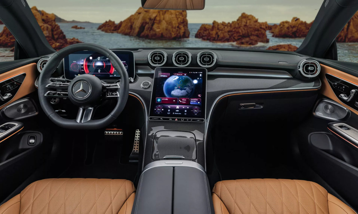 Os principais elementos internos são o painel digital de 12,3 polegadas e uma tela central de 11,9, que flutua ligeiramente sobre o console. Essa configuração estreou no Classe S em 2020, também aparece no carro esporte Mercedes-AMG SL e provavelmente também estará presente no irmão coupe desse carro, o próximo AMG GT.