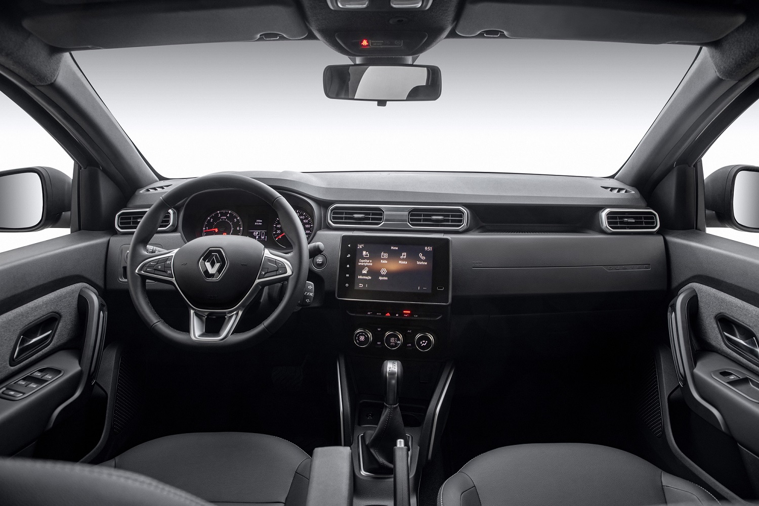 Do lado de dentro o Duster mudou bastante. Tem painel mais horizontal com quatro saídas de ar e tela central de 8″ de polegadas, maior que a anterior. O volante é multifuncional, assim como no Sandero e Logan e oferece novos itens de tecnologia.