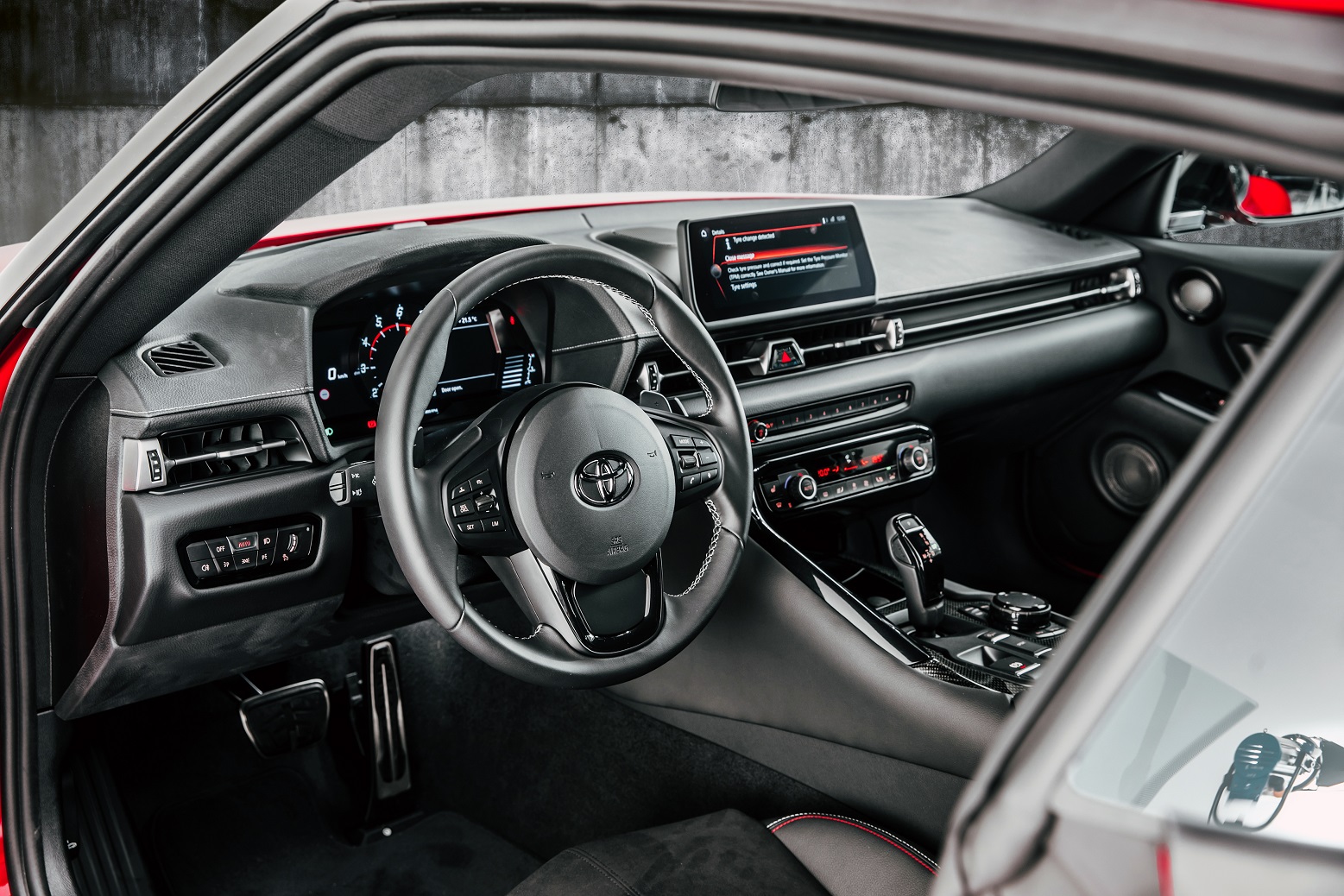 Para quem não sabe, o Supra de 5ª geração tem sangue alemão, já que foi desenvolvido em parceria com a BMW – no qual o resultado dessa aliança saiu o novo Z4. Vale lembrar: ambos são produzidos na fábrica da Magna Steyr, na Áustria. Basta dar uma olhada na cabine para ver que há uma herança bávara, trazendo painel de instrumentos digital, central multimídia destacada no painel com tela de 8,8 polegadas e câmbio automático de oito marchas da empresa ZF.