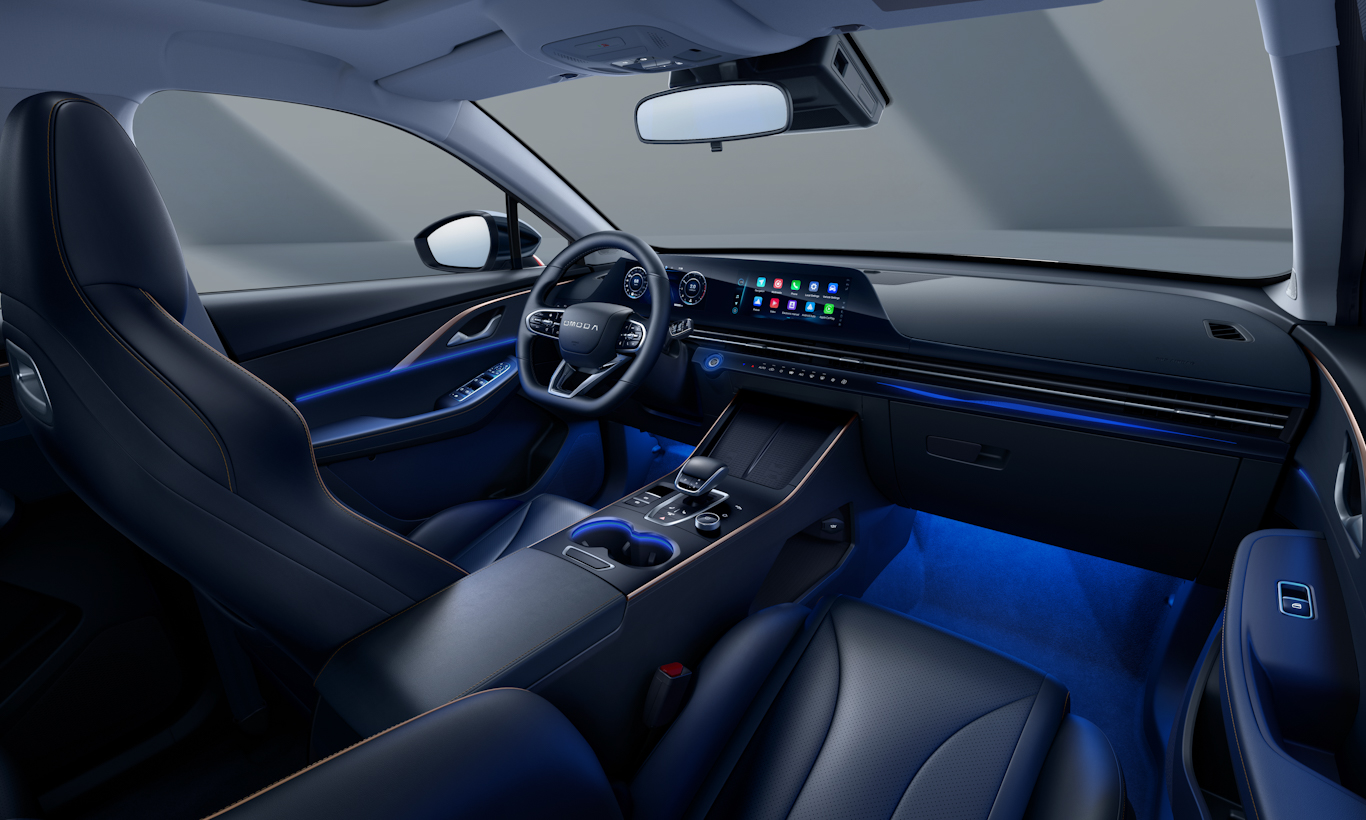 No modelo elétrico, a Omoda trouxe portas com muito material macio, parte superior do painel revestida em material emborrachado e largas faixas de couro ao longo de toda porção frontal do painel. É um acabamento de muito mais qualidade, se equiparando ao GWM Haval H6 e ao BYD Song Plus. Já o modelo a combustão, está no nível do Hyundai Creta.
