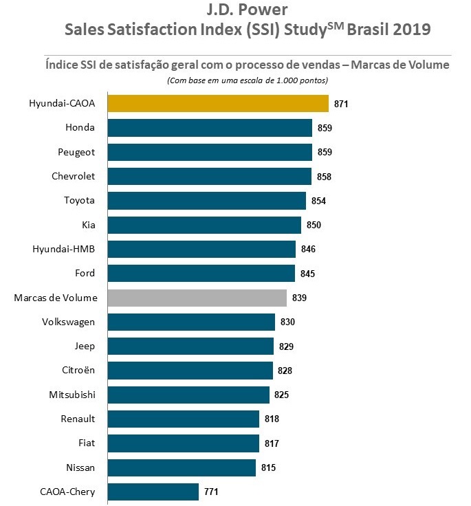 Na terceira e quarta posições ficaram a Chevrolet com 858 pontos e Toyota com 854 pontos. Segundo Fabio Braga, diretor de operações da J.D. Power Brasil, esses dados “mostram mais maturidade da indústria” e que o mercado está investindo tempo e dinheiro nos processos. Um dos pontos altos da versão 2019 da pesquisa é a crescente ascensão da Peugeot que em 2018 estava no 12º lugar e esse ano atingiu o segundo lugar.