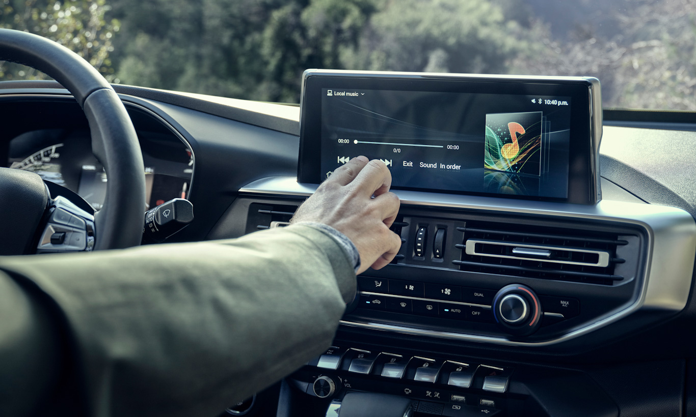 Por dentro não há o layout i-Cockpit típico da Peugeot, pois seria estranho em uma picape. Mas ela tem desenho muito semelhante aos irmãos. O volante tem tamanho normal e o painel de instrumentos é parcialmente digital apenas. Central multimídia flutuante com Android Auto e Apple CarPlay faz parte do pacote da Landtrek.