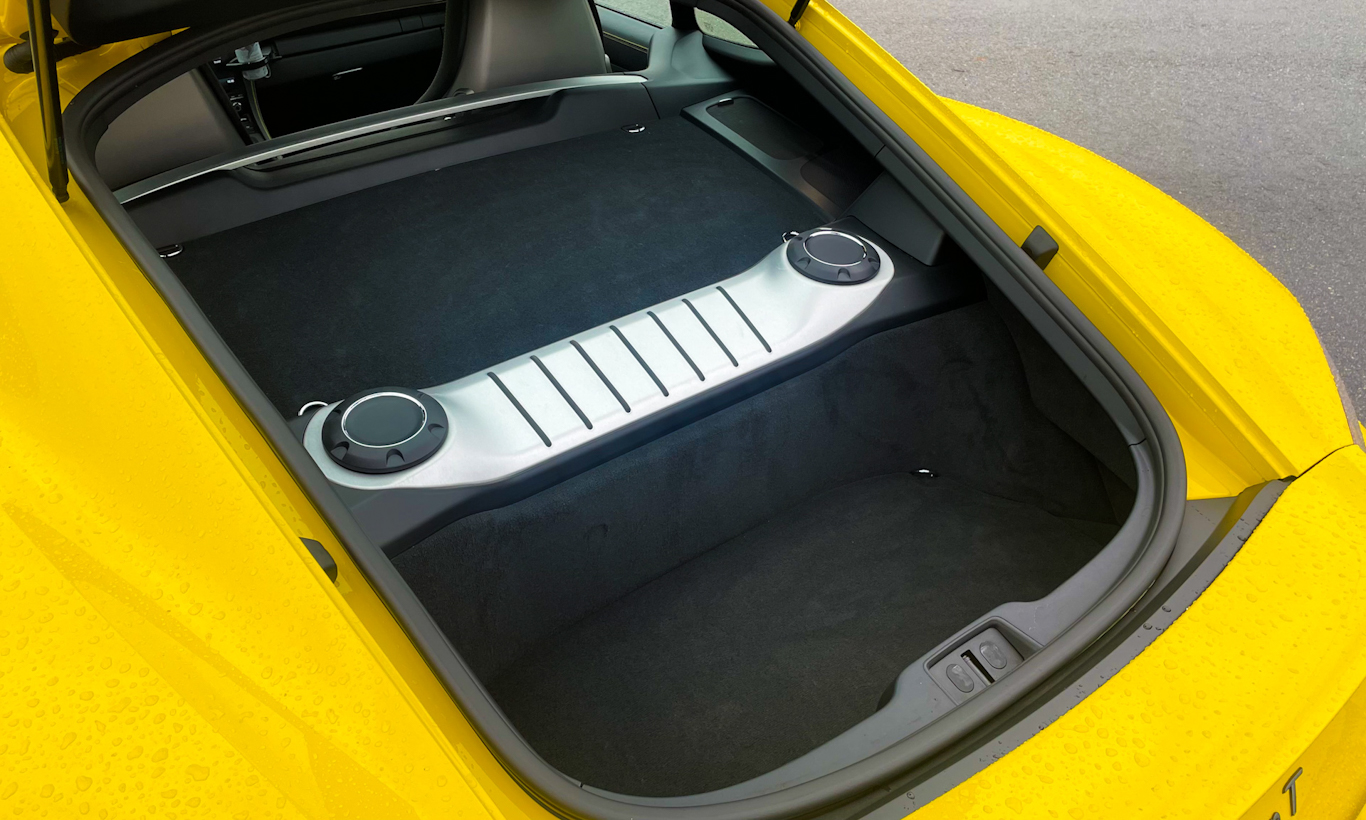Há dois porta-malas, um na dianteira com 425 litros, suficiente para uma pessoa de 1,85 m de altura cabe lá dentro (eu testei e você pode ver a foto disso no meu Instagram). Já o traseiro leva 275 litros. Ou seja, é um carro que tem pouco espaço na cabine, mas consegue levar as malas de um final de semana de um casal exagerado.