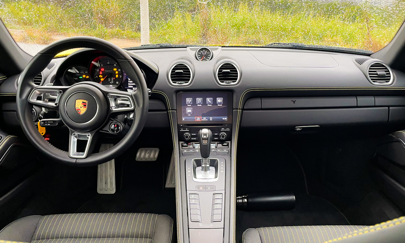 Não há sistemas modernos de auxilio de condução como frenagem autônoma de emergência, alerta de ponto cego ou piloto automático adaptativo. Talvez sejam esses os sinais da idade do 718 Cayman, junto da central multimídia pequena.