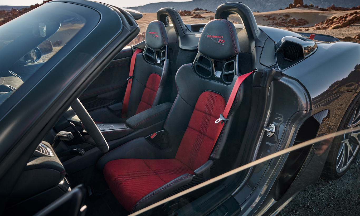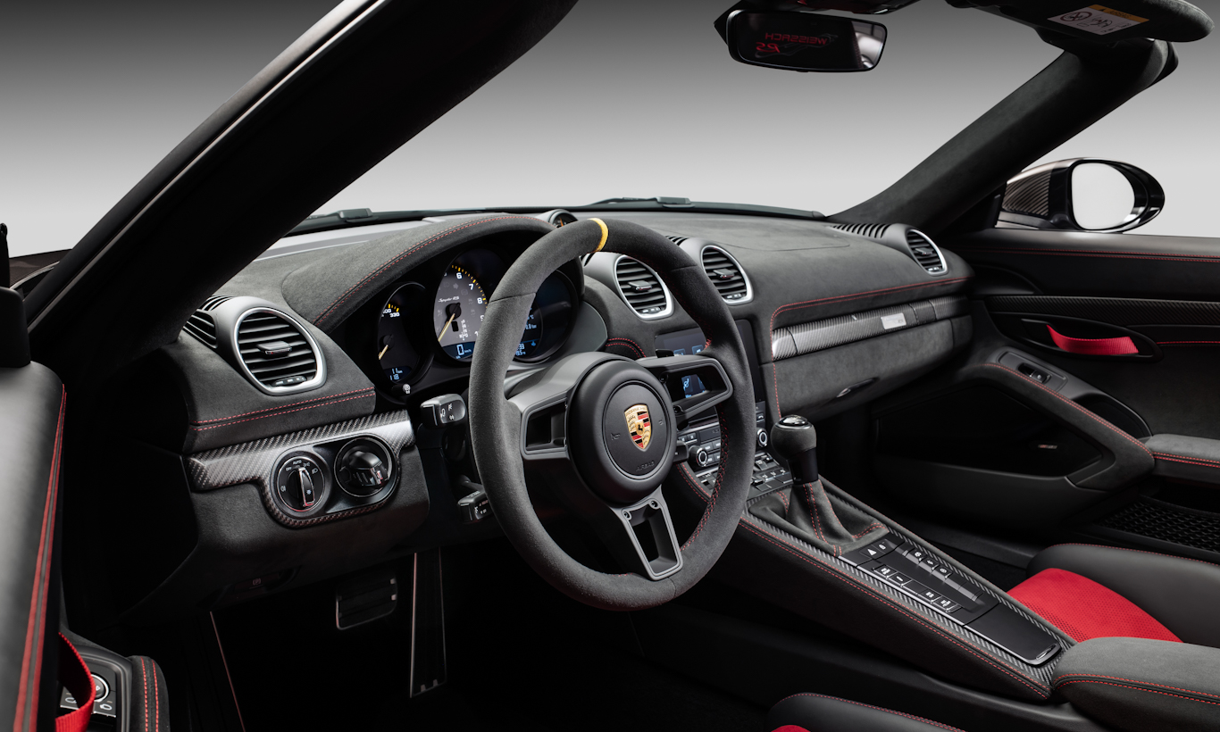 Pensado para ser um carro usável na cidade, o 718 Spyder RS conta com uma suspensão mais confortável que a do Cayman GT4, mas que é mais baixa e que pode ser ajustada de acordo com as necessidades do motorista.