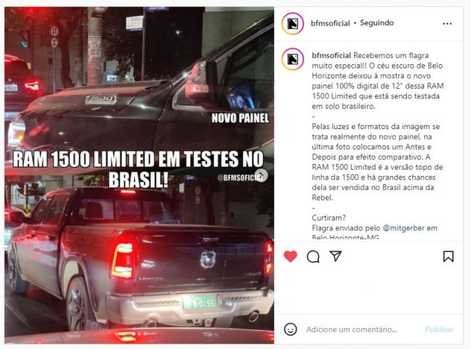 Flagra divulgado pela página BFMS mostra unidades da RAM 1500 Limited em teste no Brasil junto de uma importantíssima novidade: painel de instrumentos digital. O novo cluster estreou na linha 2023 substituindo o painel analógico atualmente usado pela 1500 Rebel. Isso será uma das novidades para o Brasil junto da estreia da nova versão.