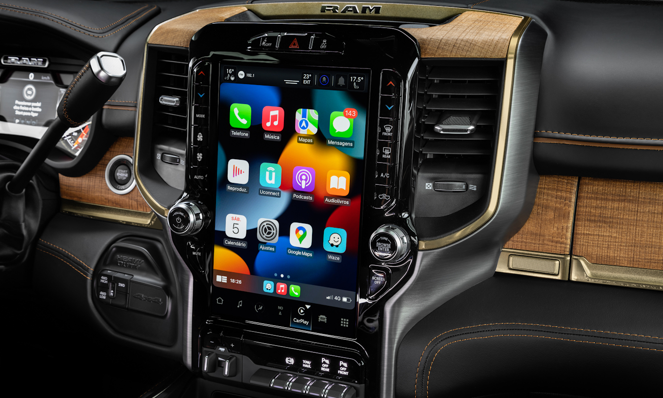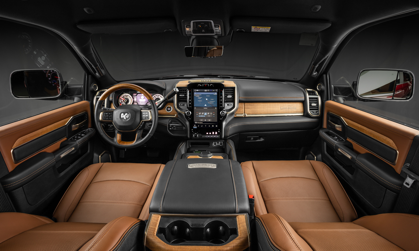 Além de caprichar no tamanho da picape, a Ram fez um interior que utiliza bastante couro e detalhes em madeira legítima. A promessa é de um acabamento interno