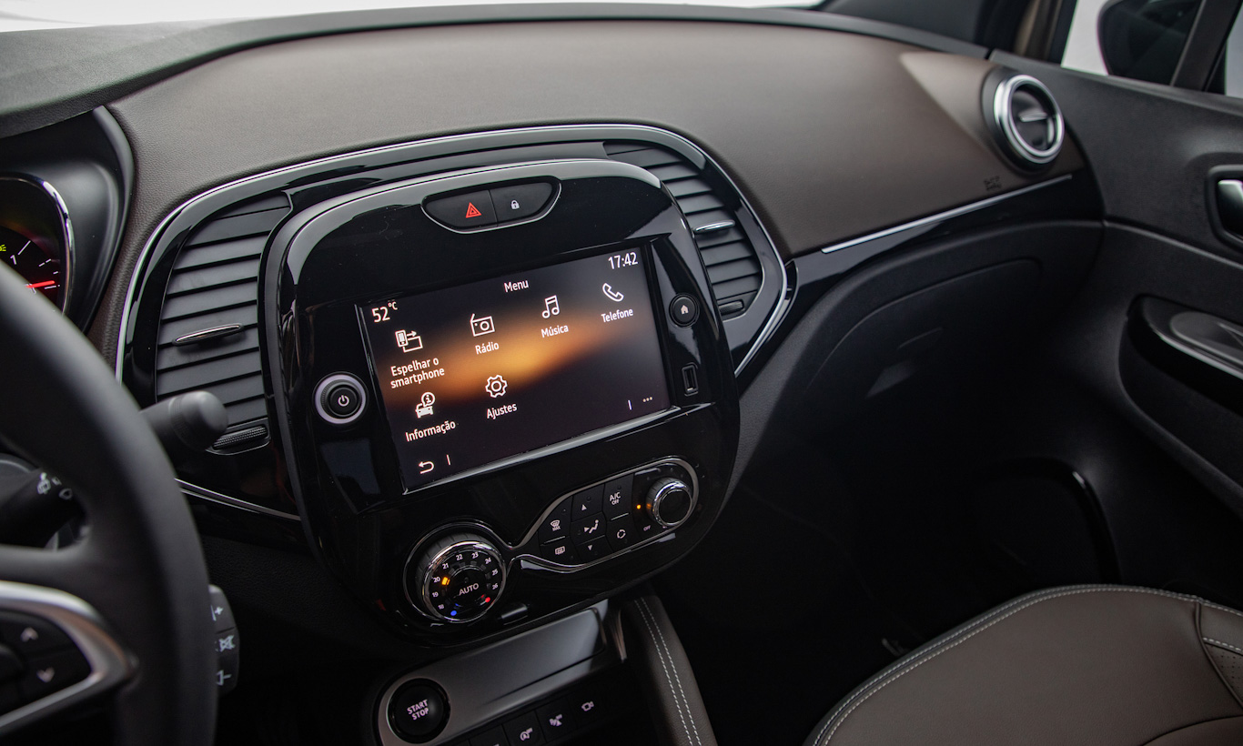 Um dos pontos nos quais o Captur sempre foi criticado era o acabamento. Para dar a volta por cima, a Renault aplicou materiais macios ao toque na parte superior do painel. Há uma faixa em preto piano dividindo a sessão superior, em marrom, da inferior, com coloração preta.