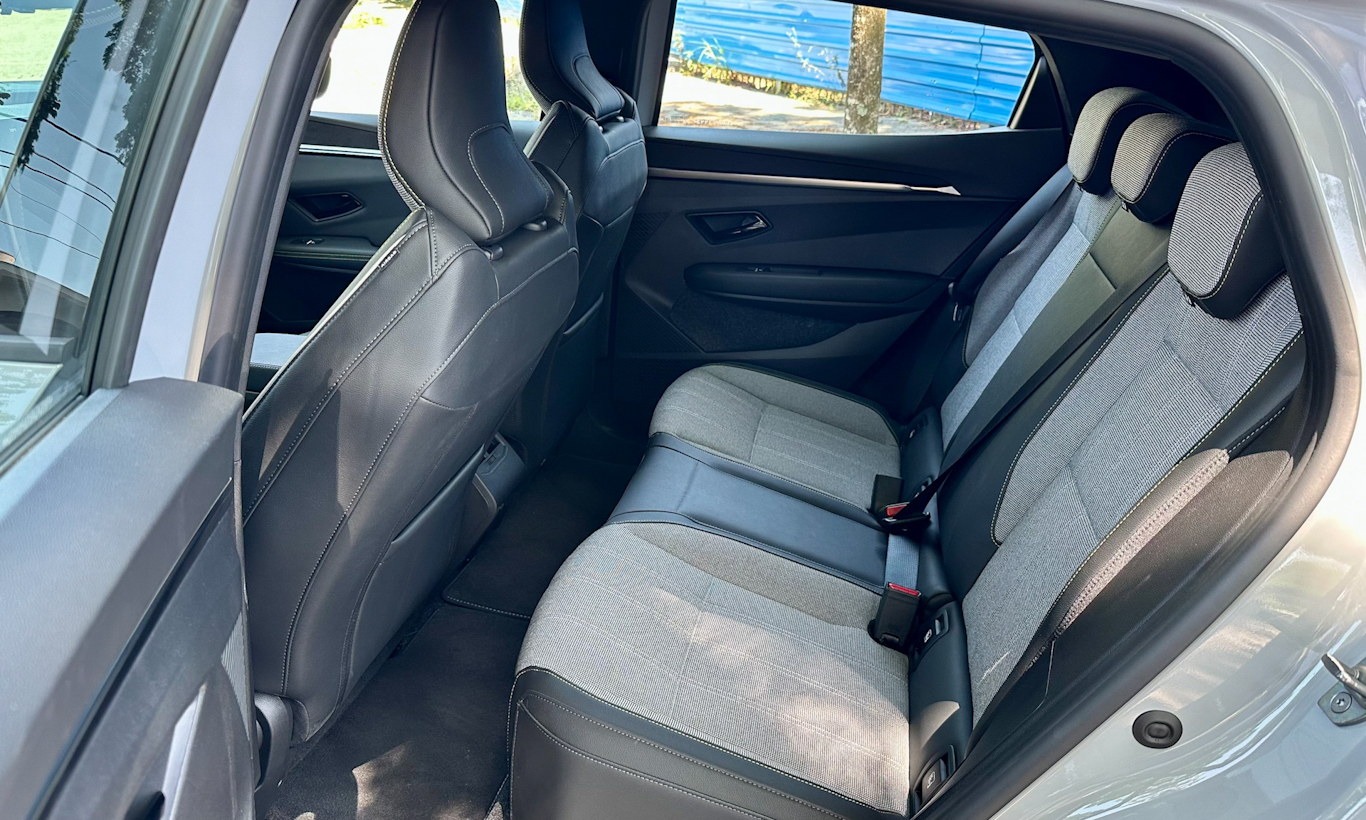 Na traseira, o espaço é bem apertado, especialmente para as pernas. Por conta das baterias, o piso é alto, fazendo com que o passageiro fique com o joelho excessivamente elevado, causando desconforto. Além disso, a cabeça raspa no teto, enquanto a linha do vidro deixa as coisas um tanto quanto claustrofóbicas.