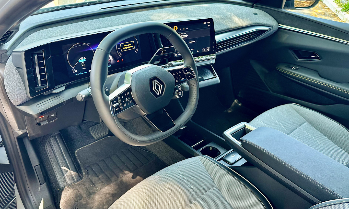 Por dentro, o Megane E Tech traz elementos visuais modernos, com linhas horizontalizadas e clean, quase como uma escola Volvo de design, mas com certo ar de Peugeot. Isso se dá por conta do volante quadrado e das costuras verdes nos bancos, normalmente encontradas nos modelos elétricos do leão. Mas também pelo tecido do painel, parecido com o do 3008.