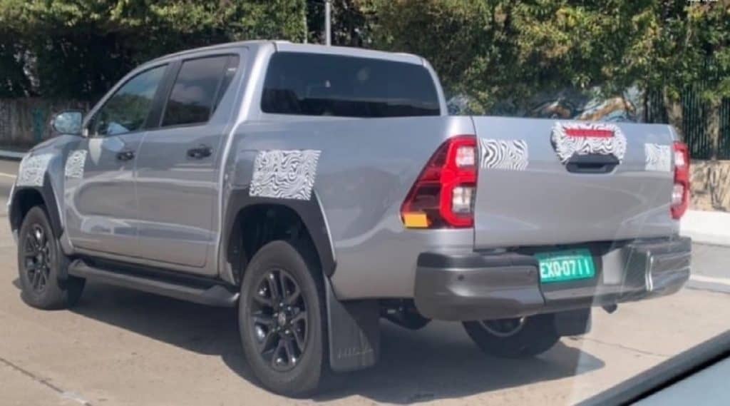 Há santantônio tubular com desenho diferenciado, ausente no modelo flagrado, além de cobertura plástica com nome Hilux na maçaneta. Para-choque com acabamento acinzentado também faz parte do kit decorativo da Hilux off-road. Além disso, ela conta com pneus off-road e rodas de liga-leve pretas.