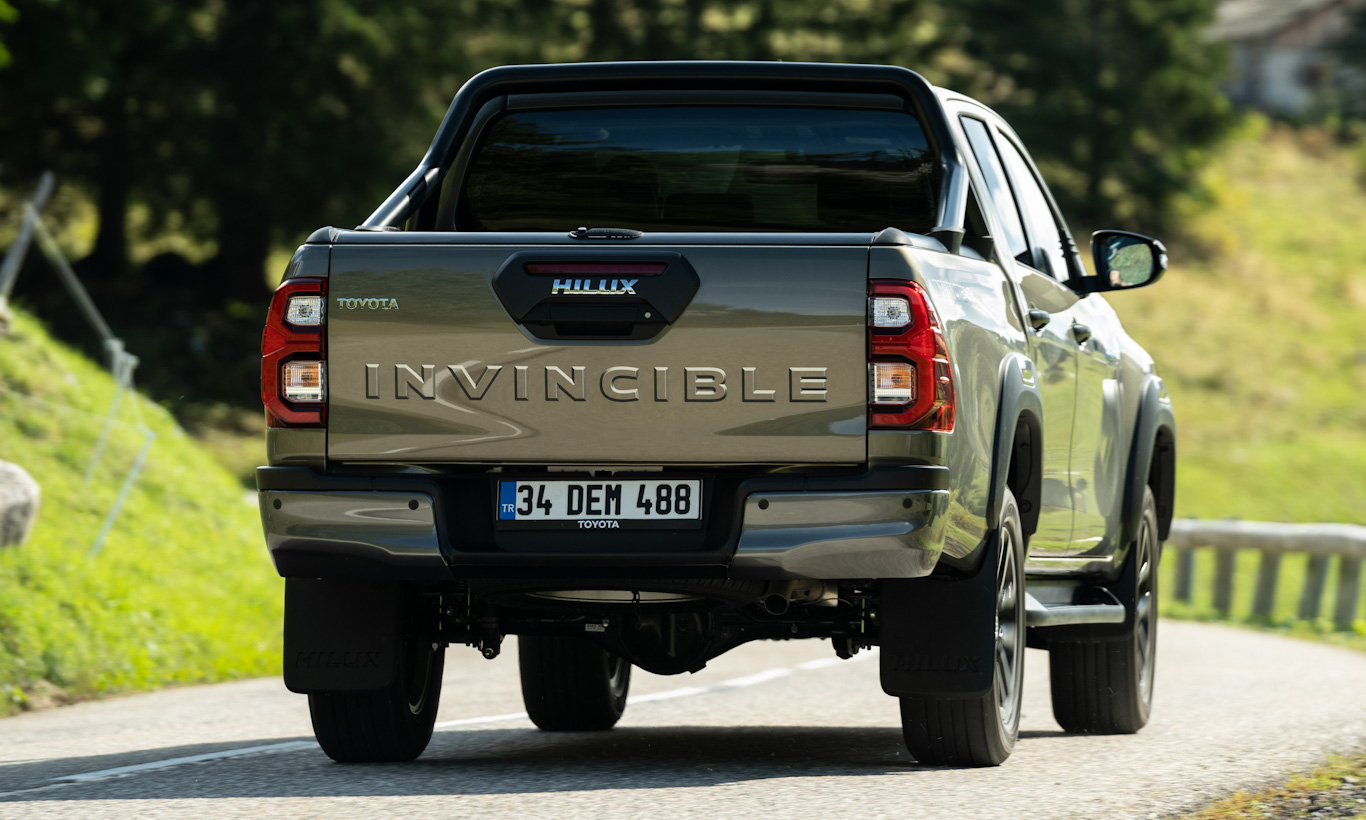 Caixa de roda dianteira mais qudrada tem plástico preto para deixar a Hilux mais parruda. É interessante notar que o extensor do para-lama se integra à luz de neblina dianteira. O para-lama traseiro também tem cobertura plástica. Na traseira, o nome Invincible ou Rocco é estampado diretamente na tampa da caçamba.