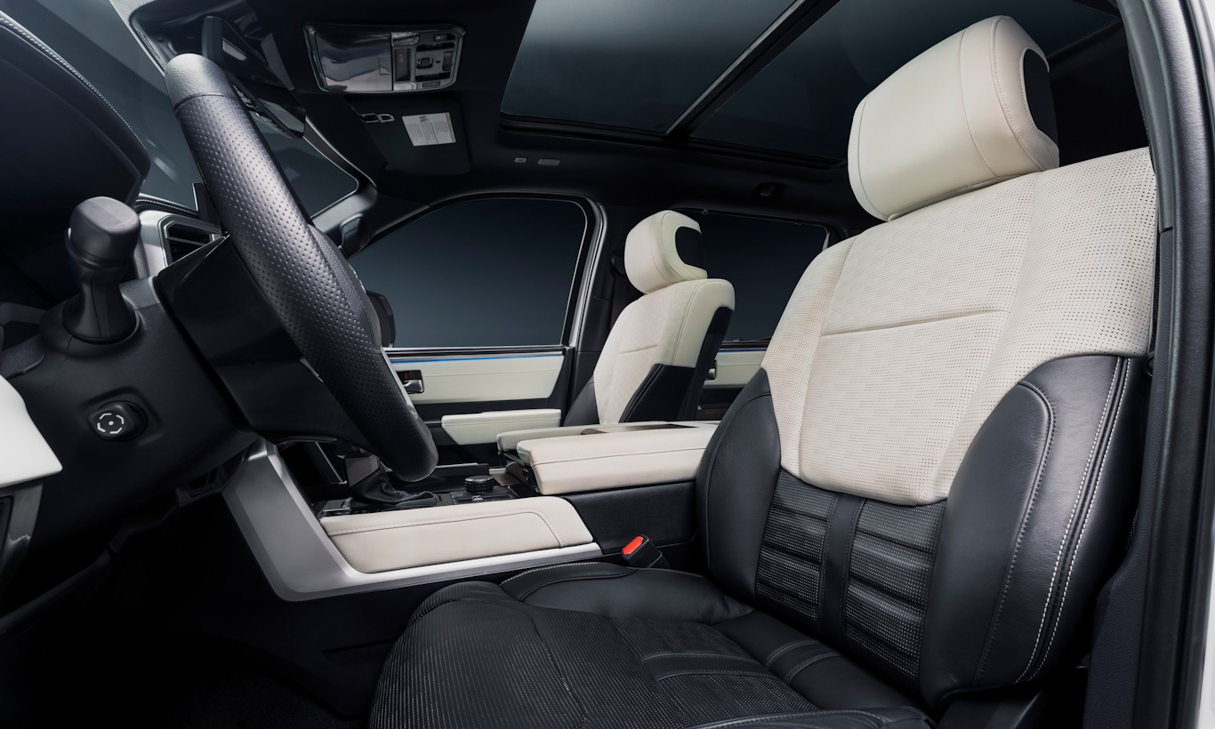 A Tundra Capstone ainda conta com degrau elétrico para a caçamba e estribo lateral retrátil eletricamente. Debaixo do capô reside o motor híbrido i-Force Max V6 3.5 a gasolina trabalhando em conjunto com um elétrico para entregar 443 cv e 80,5 kgfm de torque. Na caçamba, ela consegue levar somente 674 kg, mas reboca até 4.690 kg.