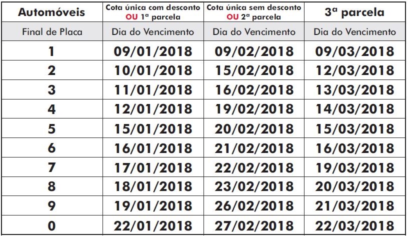 Segundo o Governo de SP, o vencimento da primeira parcela do IPVA começa em 9 de janeiro para automóveis, caminhonetes, ônibus, micro-ônibus, motos e similares. O proprietário poderá escolher entre pagar o valor total do imposto com desconto de 3,0% ou parcelar em três vezes sem desconto — com pagamento em janeiro, fevereiro e março, sempre de acordo com a final da placa do veículo. Há também a possibilidade de quitar o imposto em fevereiro, mas sem desconto.
