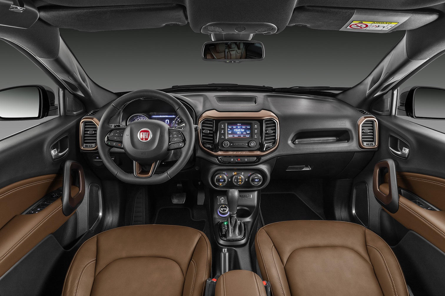 Já na cabine chama a atenção os bancos revestidos de couro marrom, cor que aparece também na moldura da central multimídia, saídas de ar e nas portas. O nome da versão aparece gravado no encosto dos bancos, nos carpetes, numa plaqueta no console e no display de 7 polegadas no painel de instrumentos através de uma animação de boas vindas na hora de dar a partida.