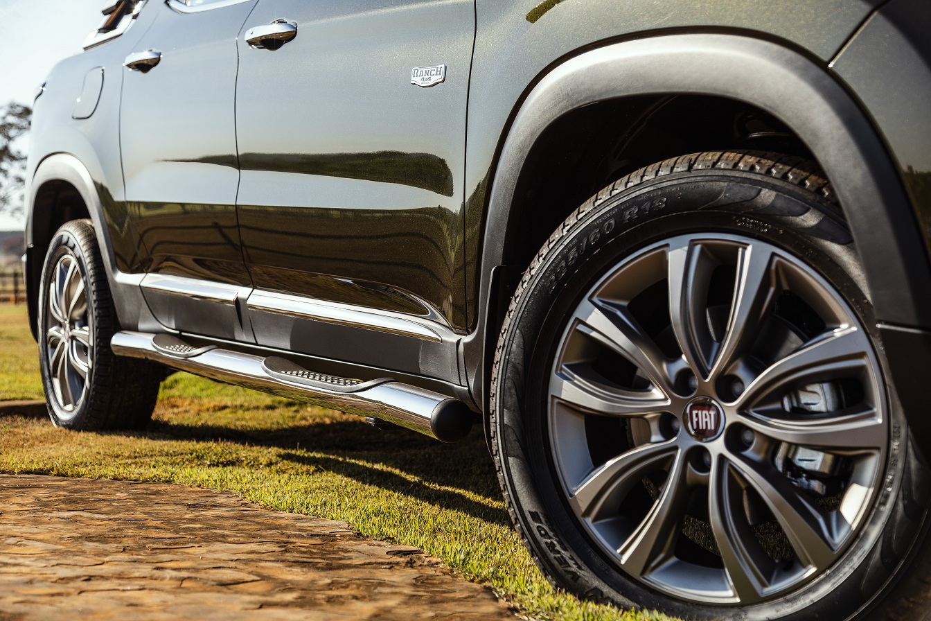 Visualmente, a Toro Ranch justifica o preço elevado ao trazer novas rodas de 18 polegadas, santantônio, proteção inferior do para-choque (skid plate) pintado de prata, estribos laterais e gancho de reboque removível.